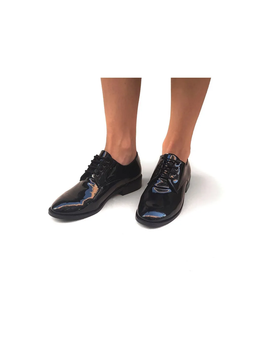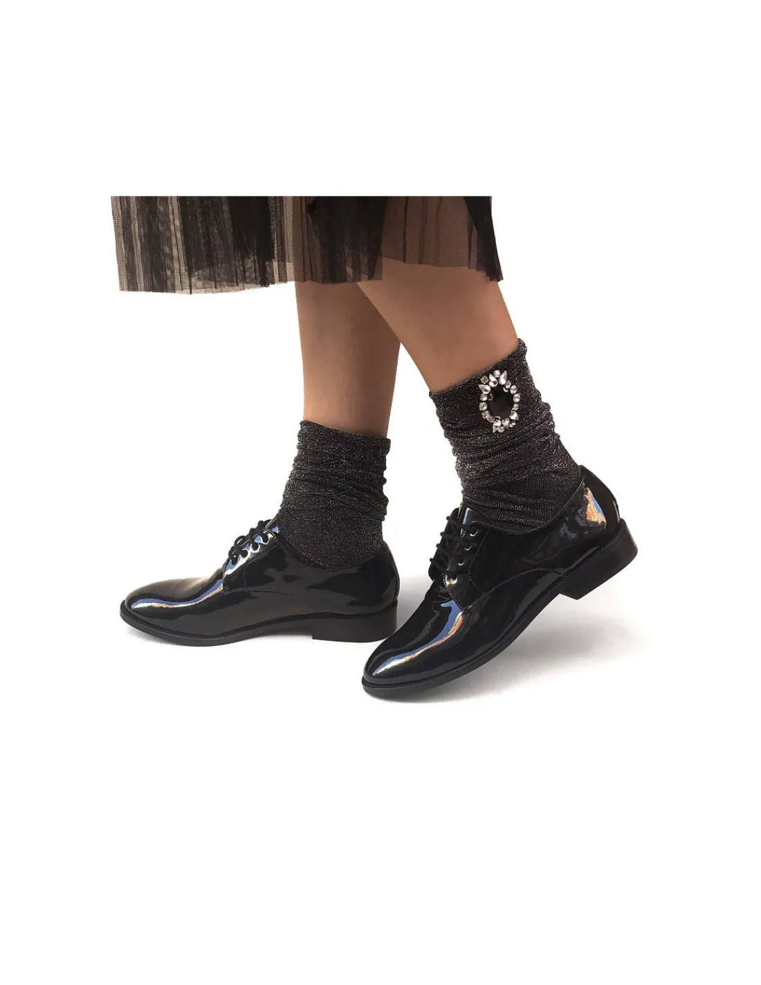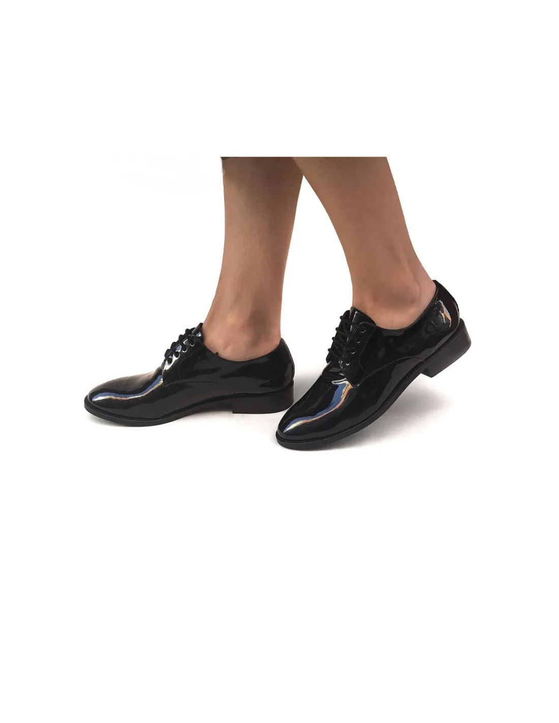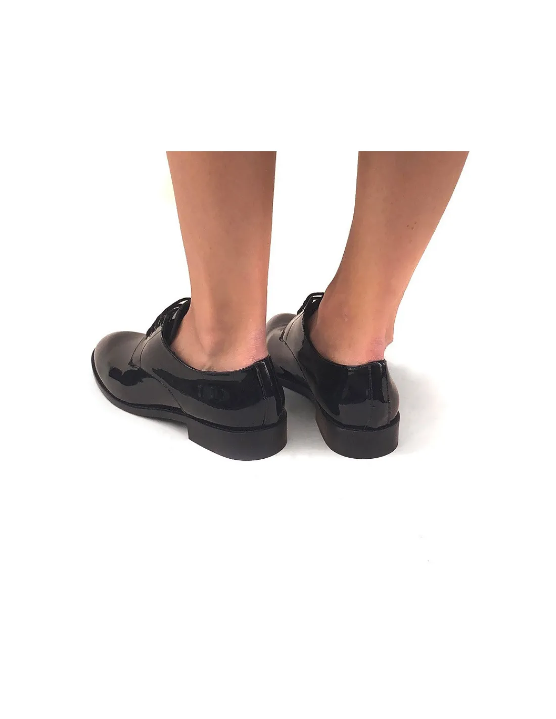 Wykonane z czarnej skóry lakierowanej. Wnętrze ze skóry cielęcej, bardzo miękkiej, aksamitnej w dotyku, również w czarnym kolorze. Forma nosków okrągła, dość szeroka, a więc z łatwością pomieści palce stóp, bez zbędnych cięć i szwów w obrębie przedniej części cholewki. Praktyczne i eleganckie w pełnym tego słowa znaczeniu.