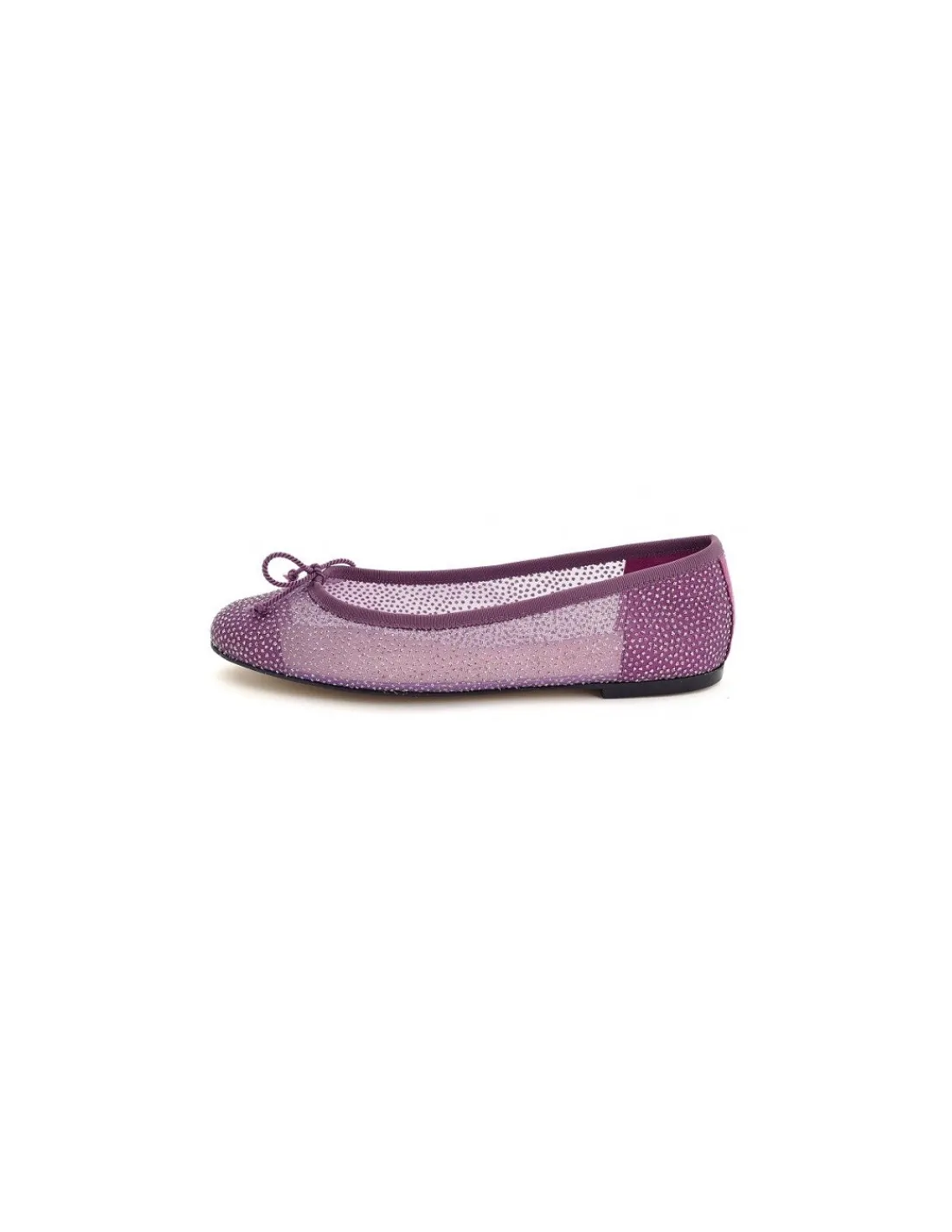 Te zostały wykonane z rety, czyli delikatnej siateczki w kolorze liliowym. Przy cholewce wykończone rulonikiem z rypsowej wstążki i zakończone niewielką, charakterystyczną dla marki kokardką ze skręconego sznureczka.