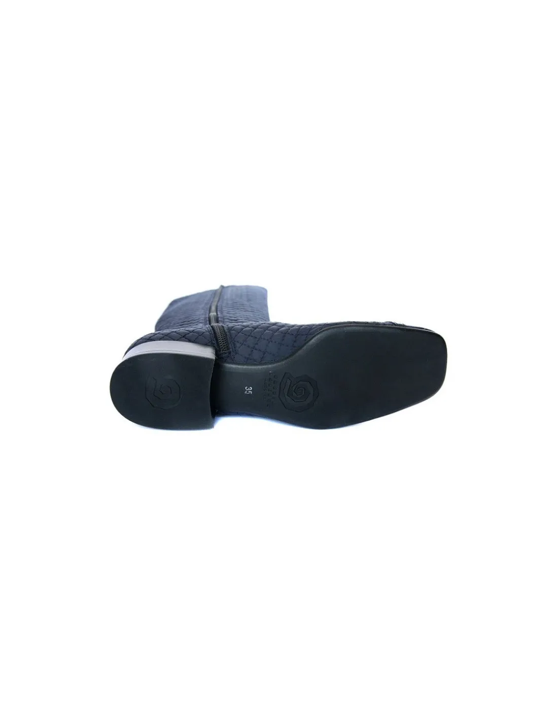 Cholewki wykonane są z tkaniny technicznej, impregnowanej, o właściwościach wodoszczelnych, pikowanej w niewielkie kwadraty, która delikatnie odbija światło (jak nylon na kurtkach puchowych). Kolor granatowy. Nosek kozaków wykończony jest skórą lakierowaną w dopasowanym odcieniu granatu. Wewnątrz wkładki i futrówki w całości ze skóry. Cholewka zapinana na zamek od strony przyśrodkowej na całej swojej długości. Zelówki miękkie z elastycznego tworzywa, logowane. Obcas prosty w formie, typu męskiego w czarnych, skórzanych obłogach.
