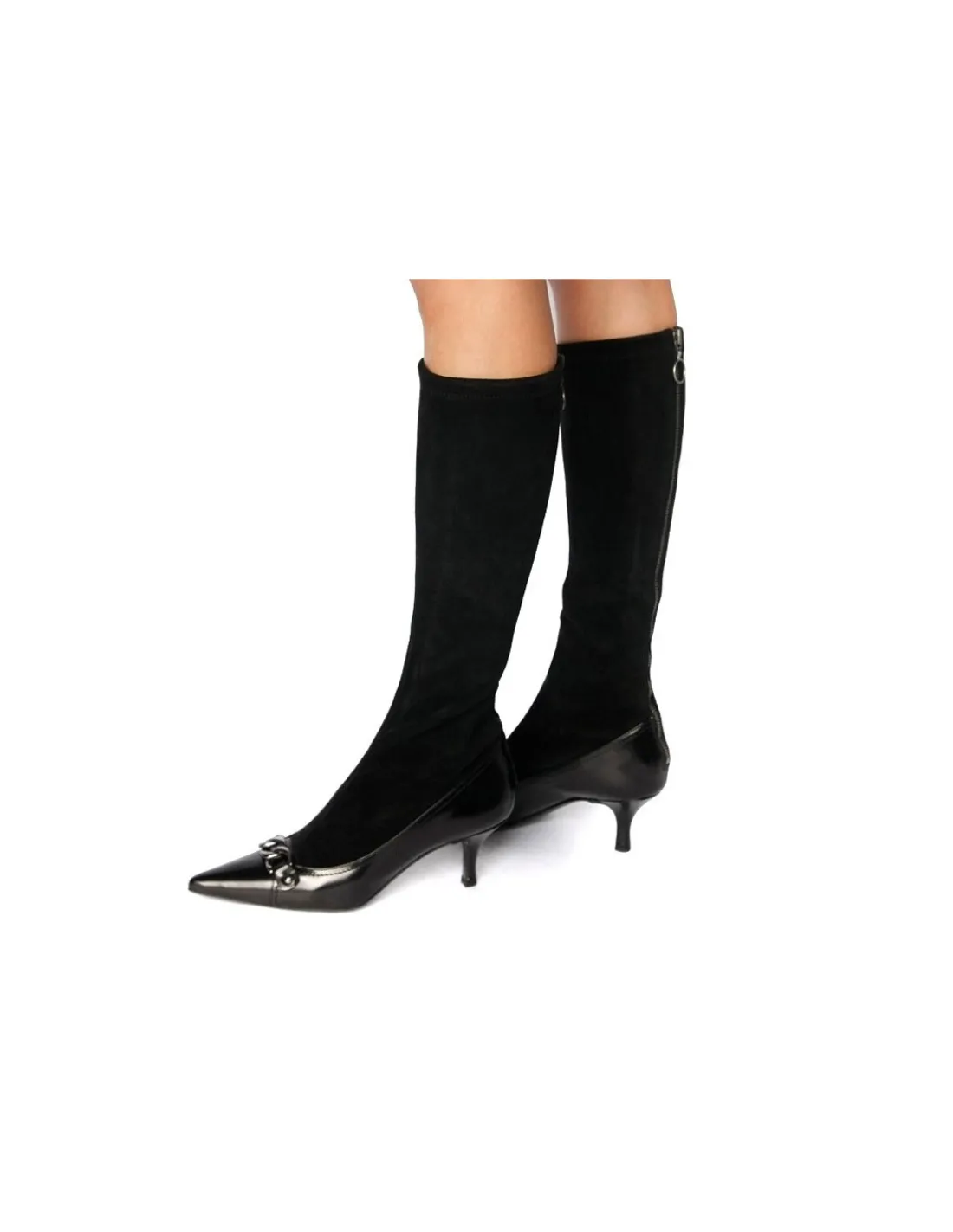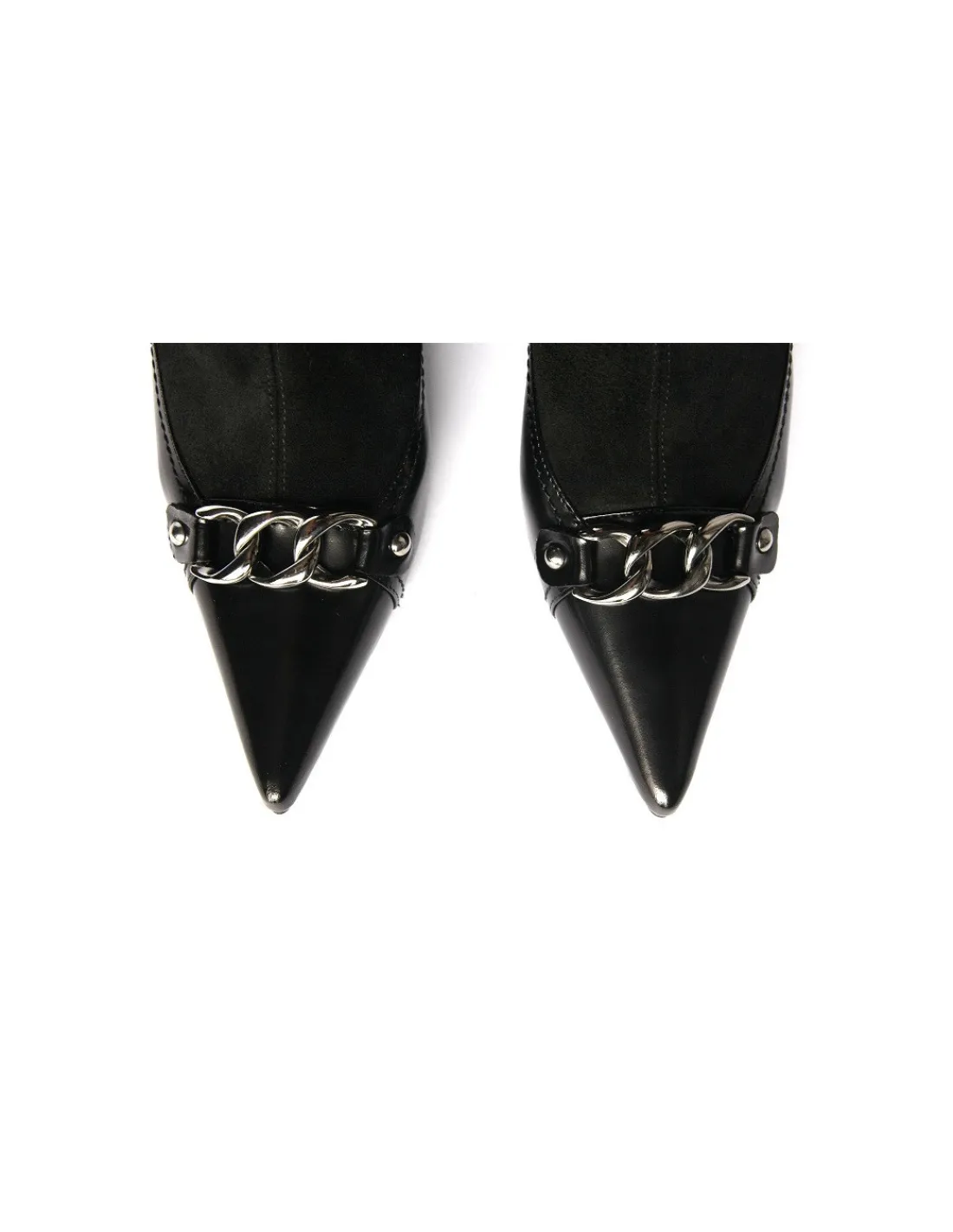 Cholewka zachowuje dość dużą elastyczność , jednak ten model dobrze prezentuję się na wąskich i bardzo wąskich łydkach. Ich zakładanie ułatwia zamek biegnący wzdłuż środka łydki i pięt. Forma butów minimalistyczna, wysmuklona. Efektu „łał ” dodaje ozdoba na noskach w postaci kilku ogniw grubego łańcucha w kolorze starego srebra.