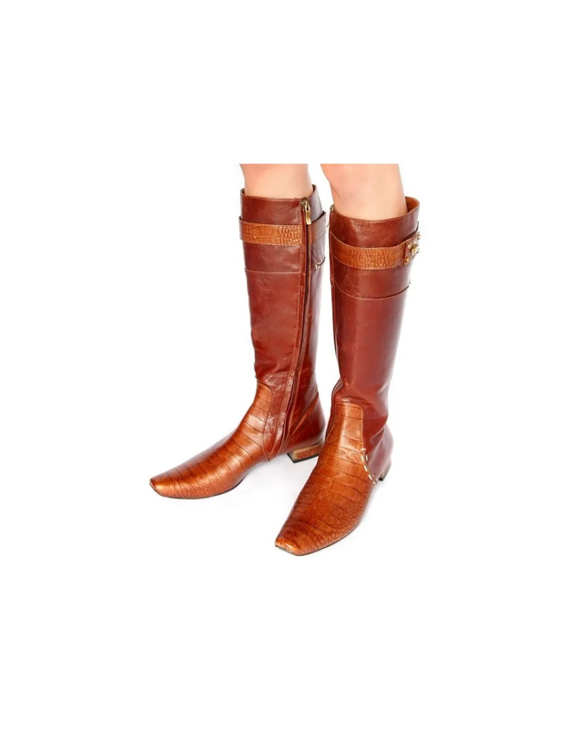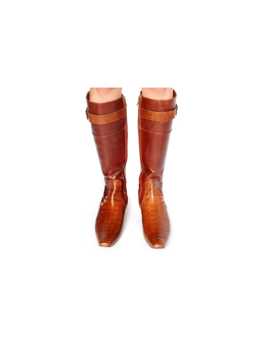 Kozaki wykonane z najwyższej jakości skór, przez wiodącą, włoską markę. Cholewka wykonana z dwóch rodzajów naturalnych skór. Skóry licowej, gładkiej w kolorze koniakowym ( rudy brąz) oraz skóry stonowanej kolorystycznie lecz wytłaczanej na wzór croco – zastosowanej na noskach i wykończeniach. Skóra ta jest delikatnie metaliczna, pozłocona. Efekt końcowy podbijają kontrastujące stębnowania wykonane ręcznie jasną, grubą nicią.