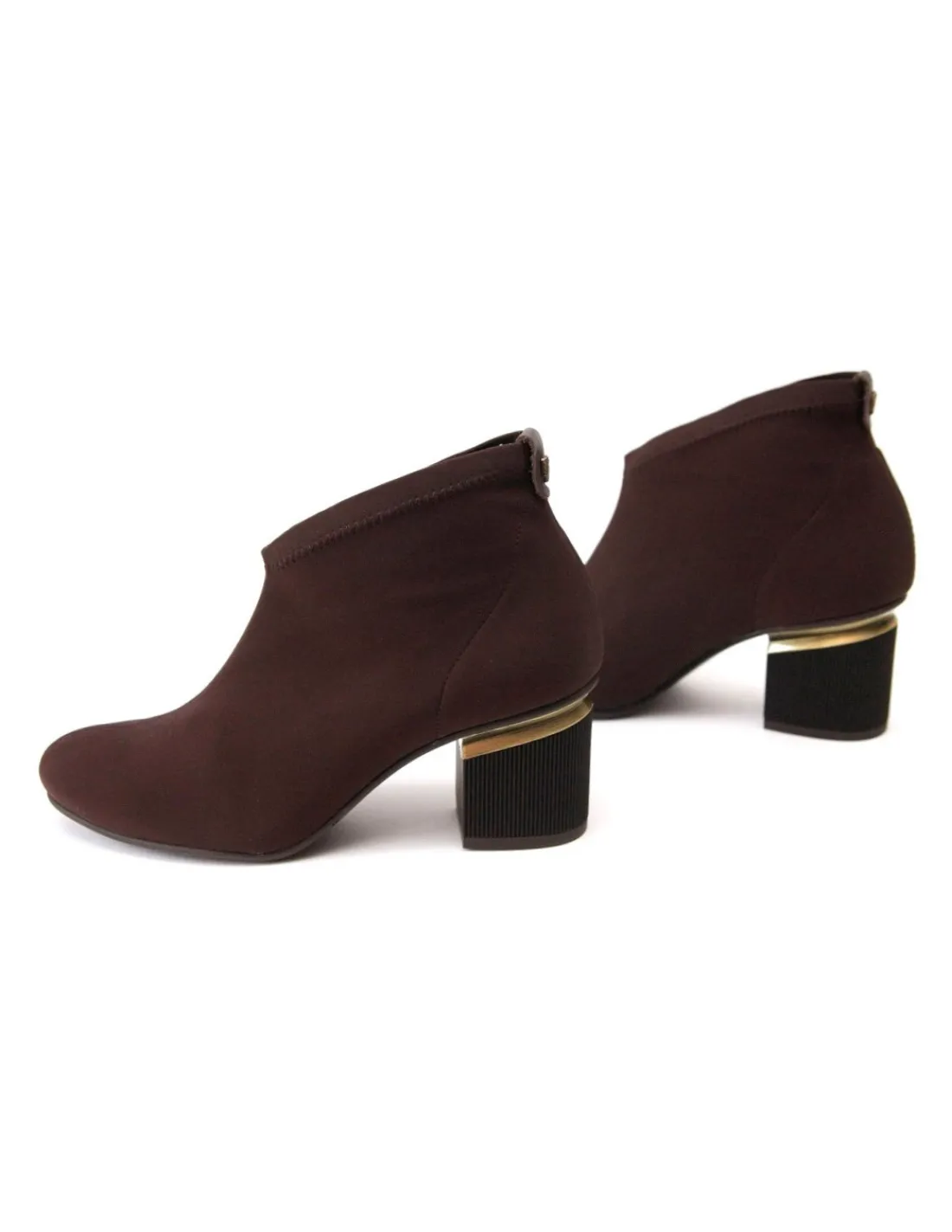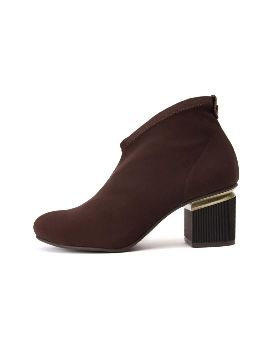Obcasy z prążkowanego tworzywa w kolorze brązowym – idealne na miejskie chodniki, bowiem odporne na uszkodzenia mechaniczne. Nad obcasami umiejscowiono metalowe okucie w kolorze starego złota – to również przemyślany zabieg. Sprawia on, że optycznie obcasy wydają się wyższe niż są w rzeczywistości.
