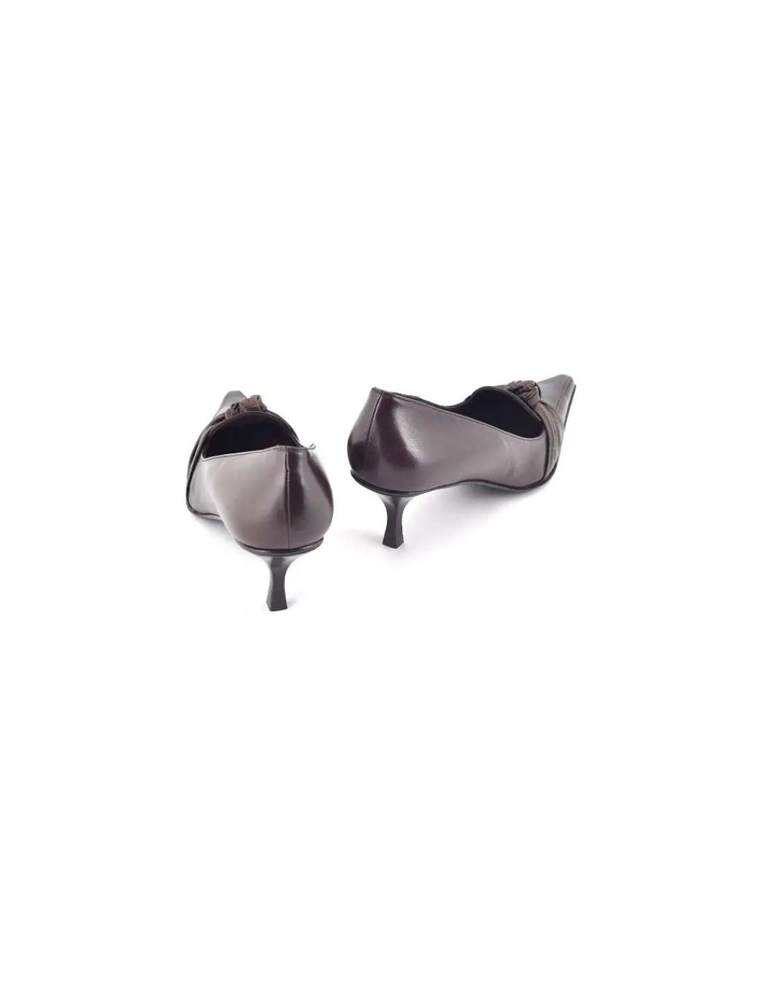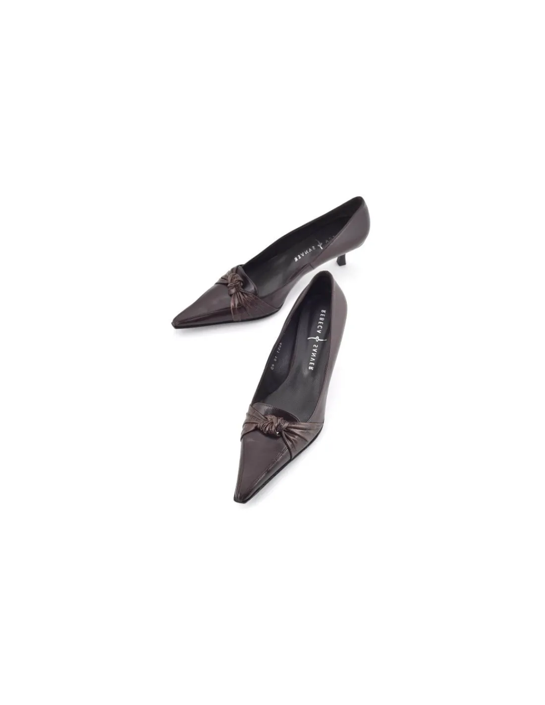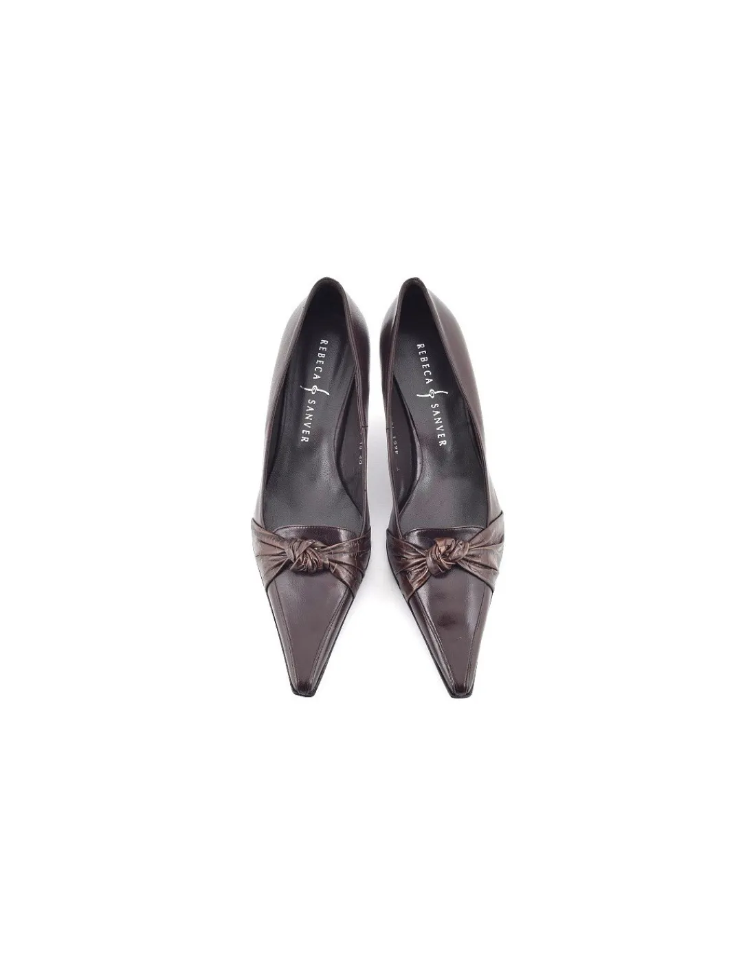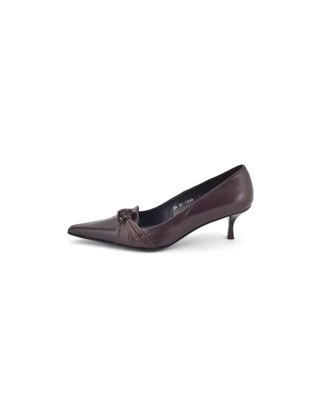 Piękna, kobieca linia, pozostająca w grupie klasyków. Na stopach prezentują się delikatnie i seksownie zarazem. Taki model nie starzeje się. Jest ikoną dobrego stylu. Wykonane z doskonałej jakości skór w pięknym odcieniu czekoladowego brązu. Skóry są mięsiste, miękkie i plastyczne, co gwarantuje wyjątkowy komfort użytkowania. Forma nosków niezwykle efektowna, lekko wyciągnięta w szpic, ale z łatwością mieszcząca palce stóp. Klasyczny wykrój cholewki zawsze się sprawdza, to w nim najlepiej wyglądają wszelkie tęgości stóp. Na noskach ozdoba w postaci „supełka” zawiązanego ze skóry croco – również w kolorystyce brązu. Wewnątrz wkładki i futrówki z bardzo miękkiej skóry licowej ze srebrnym logo marki.