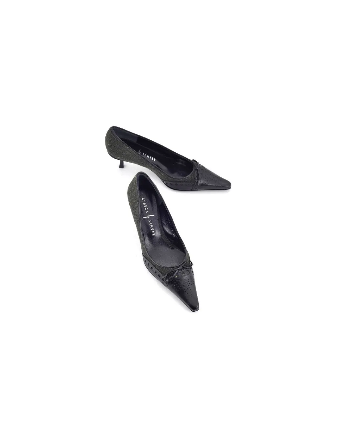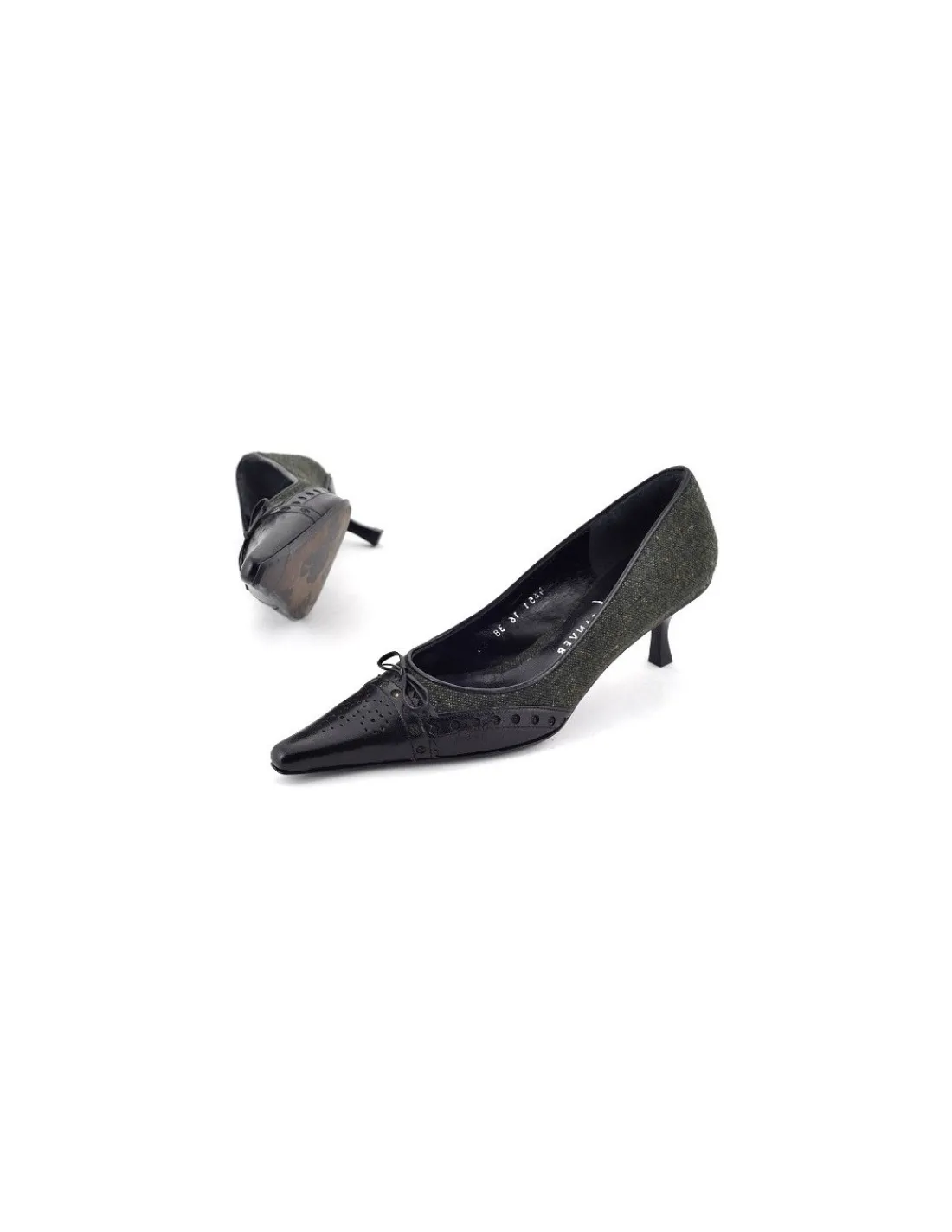 Piękna, klasyczna linia szpilek w typie francuskim. Na stopach prezentują się delikatnie, elegancko i niezwykle kobieco. Taki model nie starzeje się bowiem jest ikoną dobrego, klasycznego stylu. Wykonane z połączenia czarnej skóry licowej, oraz tkaniny typu tweed, z dyskretną lecz widoczną strukturą tkaniny w kolorystyce ciemnej zieleni. To nie są tkaniny ubraniowe ! zatem nie obawiajcie się o ich trwałość. Tkaniny techniczne są precyzyjnie dopasowane i zabezpieczone, całość dopracowana na najwyższym poziomie przez mistrzów sztuki szewskiej. Czarna skóra jest swoistym wykończeniem nosków w stylu i charakterze wprost zaczerpniętym z męskich półbutów brogues z charakterystycznym perforowaniem i niewielką rozetą na noskach. Poniżej podbicia niewielka skórzana kokardka dodaje charakteru tym delikatnym szpilkom. Forma czółenek klasyczna, efektowna wysmuklona z noskami zakończonymi w szpic z równoczesnym zachowaniem wszystkich prawideł ergonomii. Klasyczny wykrój cholewki zawsze się sprawdza, to w nim najlepiej wyglądają wszelkie tęgości stóp. Wewnątrz wkładki i futrówki z bardzo miękkiej skóry licowej również w kolorze brązowym, ze srebrnym logo marki.