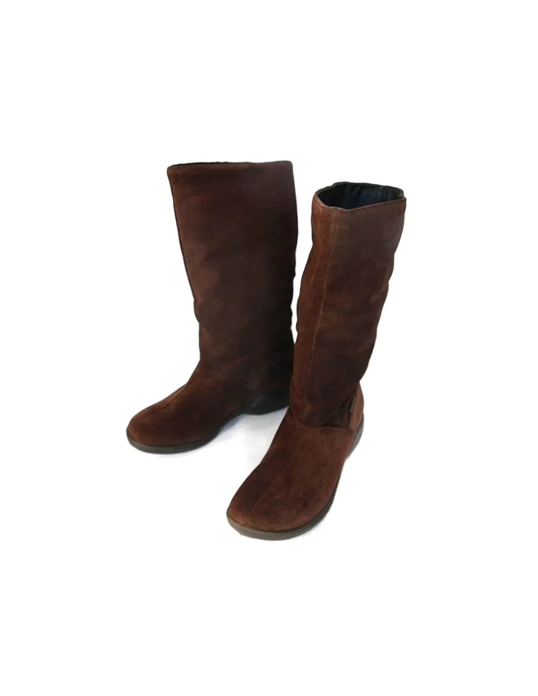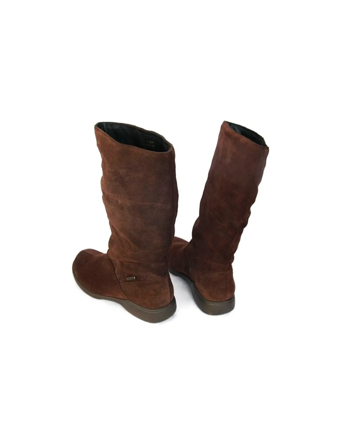 Wykonane z niezwykle miękkiej skóry zamszowej w kolorze brązowym. Wciągane, bez zamka. Cholewki delikatnie marszczone, nie będą opinać łydek. Podszewki ze śliskiej tkaniny ułatwiającej zakładanie. Władki skórzane. Dość grube spody z tworzywa nie chłoną wilgoci – świetnie amortyzują miejskie nierówności, chronią też przed mrozem.