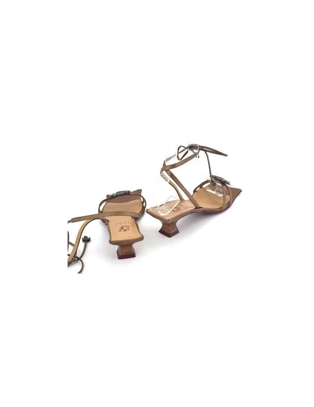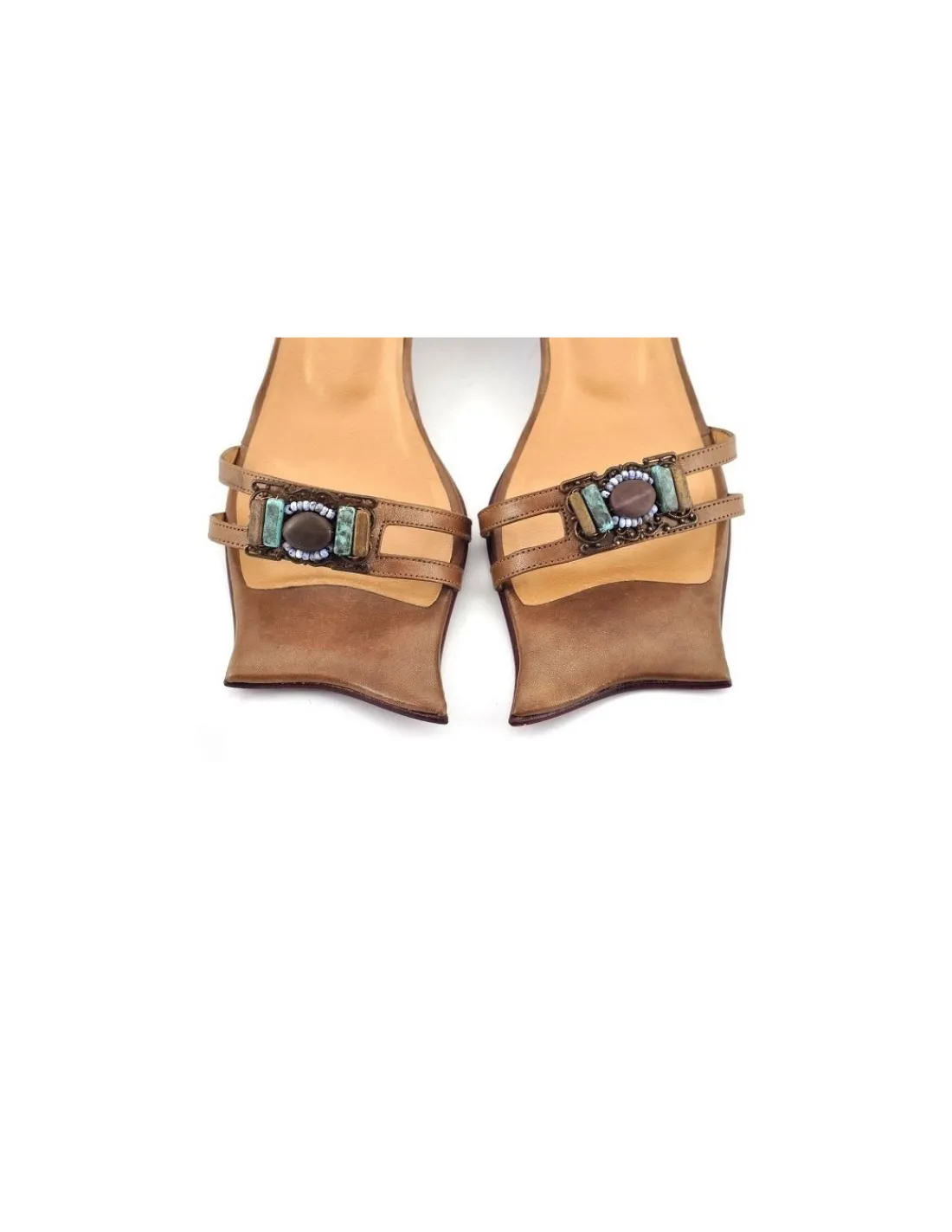 Wszystkie paski i obłogi obcasów wykonano z aksamitnej w dotyku skóry w kolorze brązu, miedzi, starego złota. Jest delikatnie perląca się, metaliczna. Efektownie zamontowane paseczki przytrzymują stopę na wysokości palców podkreślając kobiecość. Na obu paseczkach zamontowana ozdoba składająca się z kamieni: turkusów i koralików toho nanizanych na elementy miedzi i mosiądzu, efektownie kontrastując z kolorem skóry, z której są wykonane. Cała kolorystyka jest bardzo efektownie zestawiona – prawdziwe dzieło sztuki użytkowej. Cienkie, skórzane paseczki pozwalają na wiązanie sandałków na kilka różnych sposobów. Wkładka logowana, skórzana o ton jaśniejsza niż skóra sandałków.
