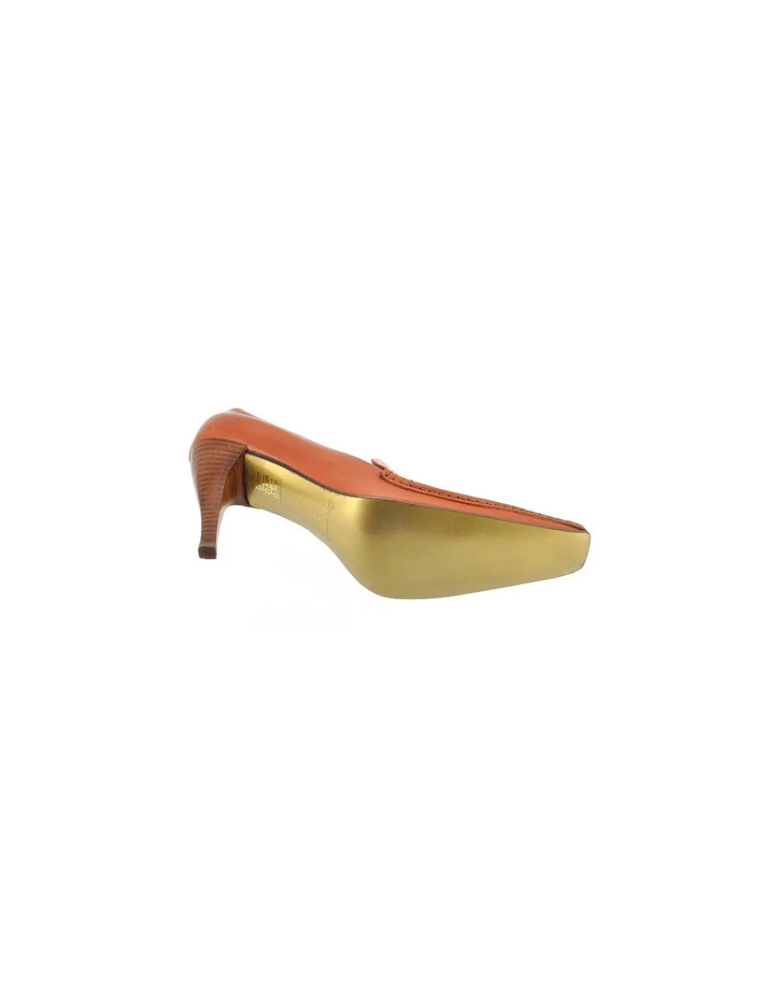 Wykonane z bardzo miękkiej skóry cielęcej w kolorze whisky. Przód zapożyczony od klasycznych loafers/ mokasynów. Cholewka szyta ręcznie, dopasowaną do koloru skóry, solidną, lnianą dratwą, czyli mocną, grubą, szewska nicią. Szwy poprowadzone są na zewnątrz, a więc nic nie uwiera paluszków od środka. Zwróćcie uwagę na piękne szycie. Takich detali nie spotyka się dziś w masowej, komercyjnej produkcji. Nosek wysmuklony, efektownie przycięty w kwadrat. Cholewka jest dość wysoko zabudowana, dochodzi do podbicia. Wewnątrz wkładki i futrówki ze skóry licowej, wkładki w kolorze złotym. Obcasy typu szpilki o rzadko spotykanej formie w brązowych, skórzanych obłogach, ręcznie woskowanych na zakończenie etapu produkcji. Skórzane zelówki w złotym kolorze.