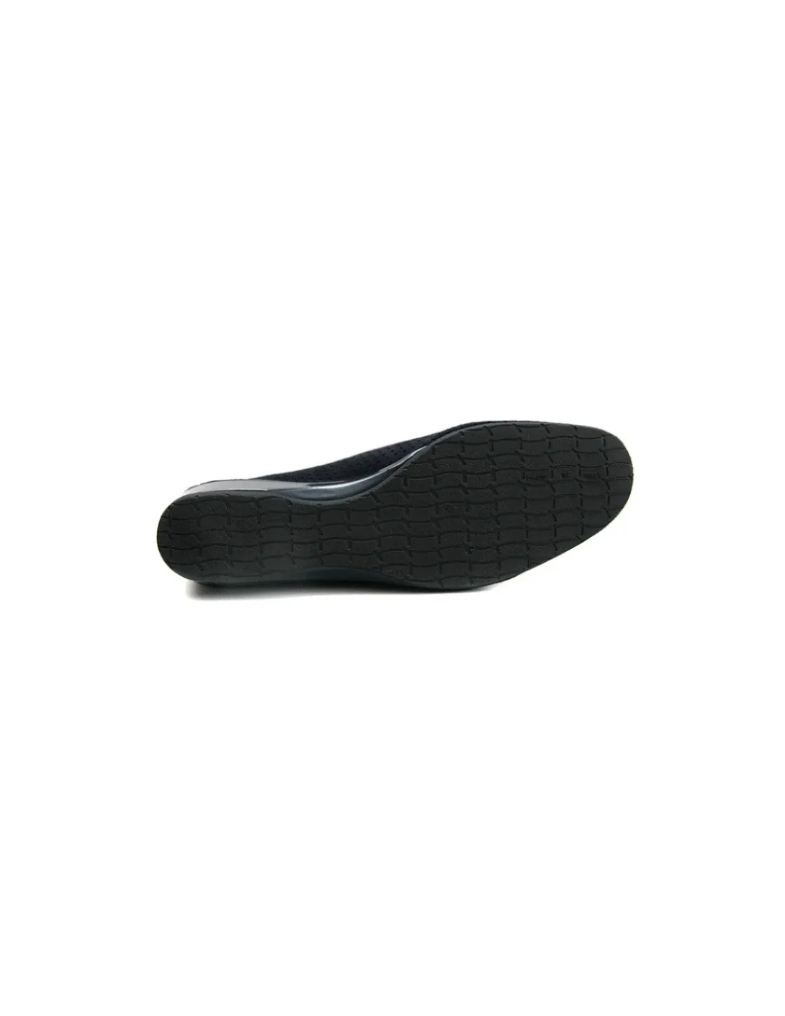 Wykonane z najwyższej jakości, miękkiej skóry zamszowej w kolorze granatowym. Skóra z ażurowaniem i jest to wystarczający powód by korzystać z nich również latem na bose stopy. Zapiętki nie są usztywniane tak jak w klasycznym obuwiu. Niewysoki koturn został obłożony granatową skórą lakierowaną.