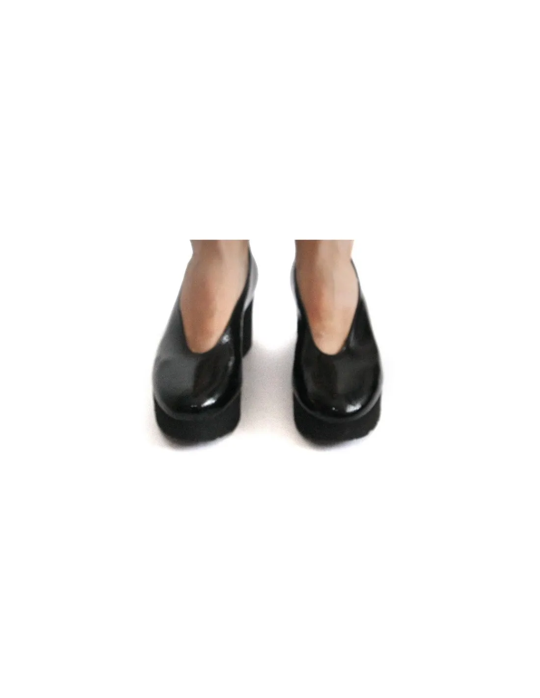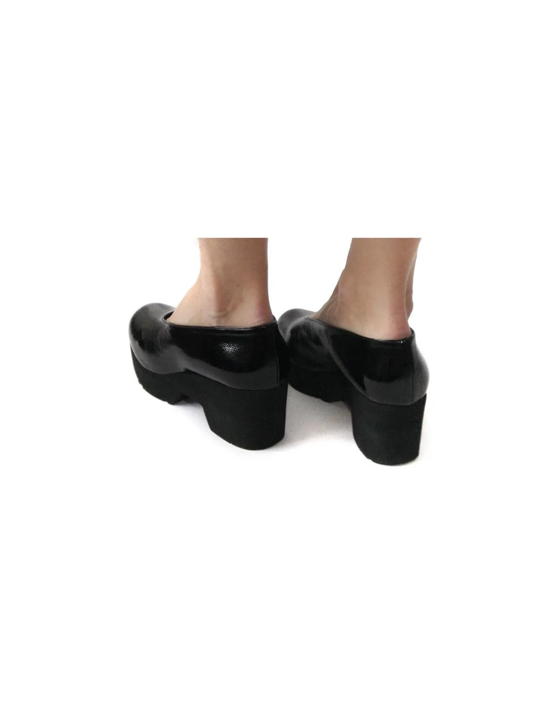 Spody, platformy czarne, lekkie jak piórko. Wykonane z napowietrzonej gumy, dzięki czemu pracują podczas chodu. Wysokość kompletnie nie jest odczuwalna, w tylnej cześć 6,5 cm, a z przodu 3 cm – a więc skłon stopy to jedyne 3,5 cm. Zelówki wykonane z logowanej lekkiej gumy o doskonałych właściwościach, sprawdzone od wielu lat produkowane za specjalne zamówienie marki.
