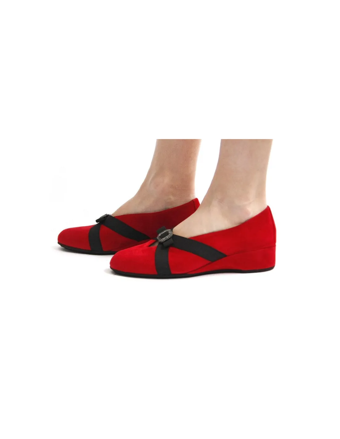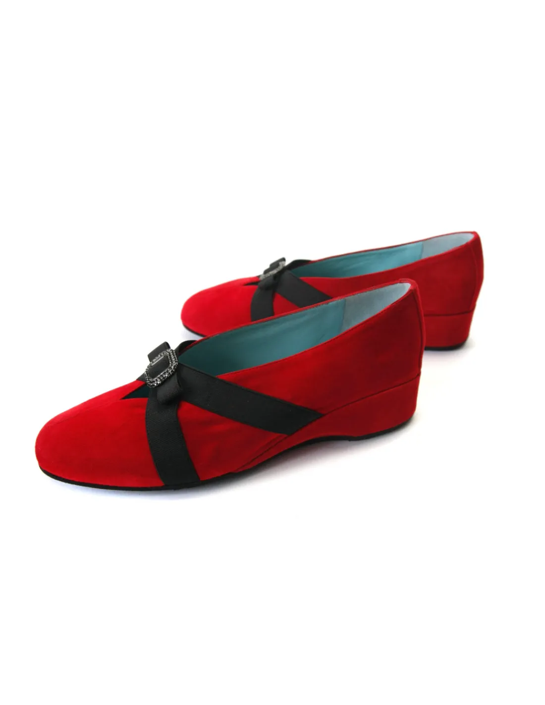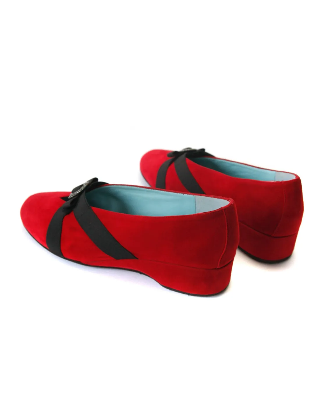 Wykonane z najwyższej jakości, aksamitnej w dotyku skóry zamszowej w pięknym, głębokim odcieniu czerwieni. Forma nosków obła, dość szeroka. Klientki w naszym sklepie stacjonarnym są zachwycone jak dobrze się dopasowują. Na wysokości podbicia wszyto czarne gumy, które dopasowują cholewkę do kształtu i szerokości stopy. W miejscu krzyżowania się gum zamontowana jest urocza, kwadratowa klamerka wysadzana czarnymi kryształkami – ozdoba pochodzi od Swarovski, delikatnie mieni się w promieniach słońca. Wnętrze, czyli zarówno wkładki jak i wyściółki wykonane są ze skóry koziej, w kolorze niebieskim – to znak rozpoznawczy marki TR.