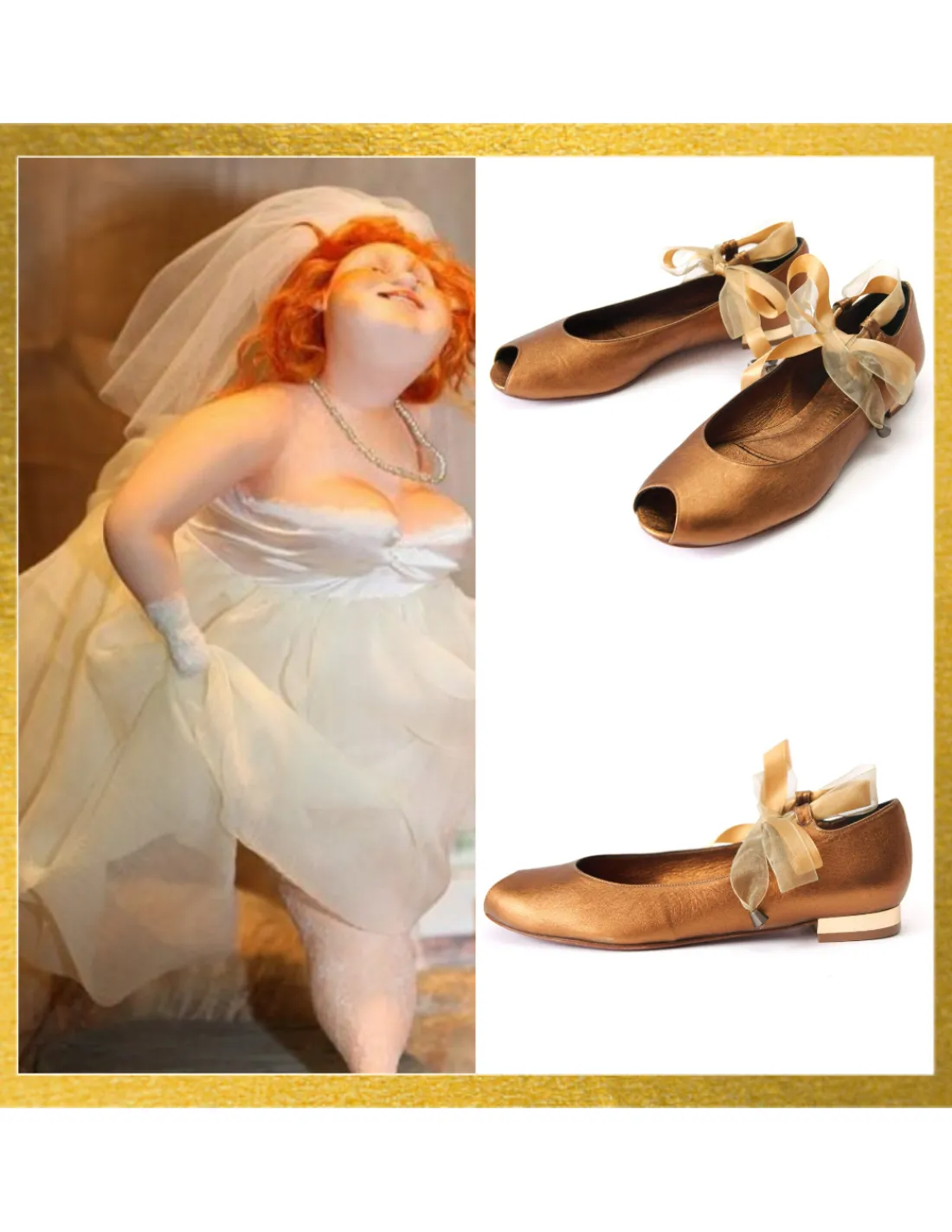 Niskie 1.5 cm obcasy są szerokie płaskie jak przystało na klasyczne balerinki. Złote satynowe i nienachalne świetnie podkreślają wyjątkowość i okazjonalny charakter.