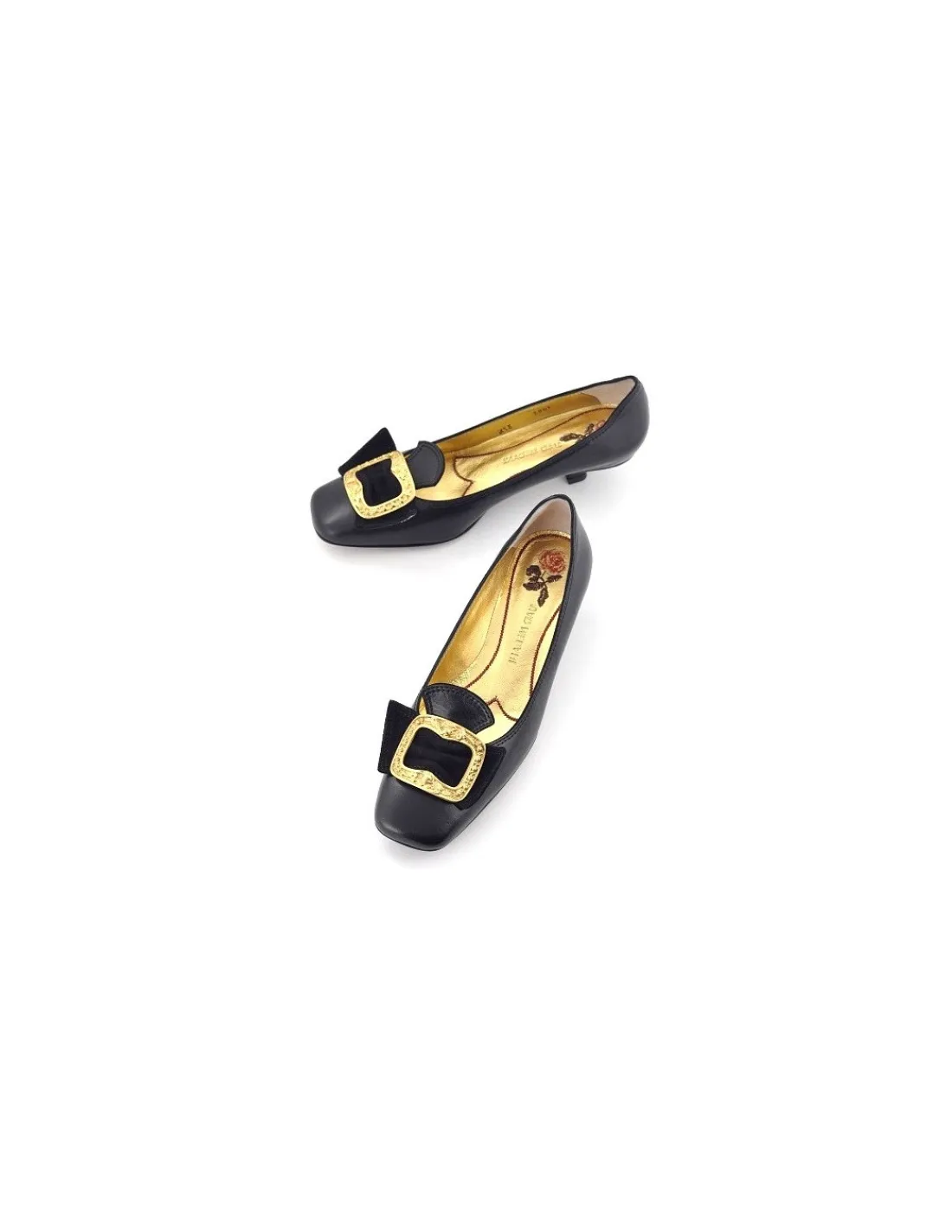 Wykonane z wysokiej jakości, miękkiej, jedwabistej w dotyku, czarnej skóry licowej. Całość dopracowana na najwyższym poziomie przez mistrzów sztuki szewskiej tym bardziej w manufakturze Uad Medani, gdzie większość produkcji wciąż ma charakter rękodzielniczy. Forma czółenek dość szeroka z noskiem ściętym w obły kwadrat który z łatwością mieści palce stóp dbając o ich komfort. Przód powyżej nosków zdobi dość duża klamra w kolorze złotym, efektownie zbierająca skórę zamszową w kształt kokardy. Jedna z końcówek tworzy swojego rodzaju „język” podnoszący się na podbiciu. Wewnątrz futrówka z jedwabistej w dotyku, mięciutkiej skóry nappa w kolorze starego złota. Pod piętami wyhaftowana róża – znak rozpoznawczy marki Uad Medani. Pamiętajcie, że iście królewska, złota wkładka jest widoczna tylko dla Ciebie – po włożeniu stopy nikt już jej nie widzi, ale czar pozostaje.