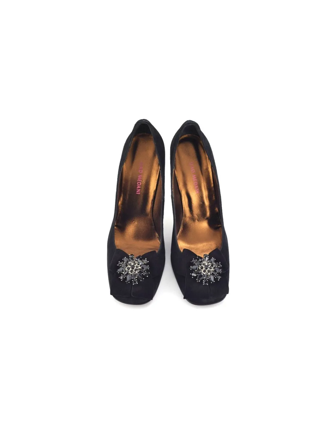 Niepowtarzalne, efektowne, autorskie czółenka. Bardzo piękna, kobieca linia. Tak zaprojektowane i wykonane są ponadczasowe, pasują do wielu stylizacji i z dużą dozą prawdopodobieństwa pozostaniecie z nimi na długo. To prawdziwa bohema wśród butów – wiecznie młoda. Wykonane zostały z ogromna precyzją, z najwyższej jakości czarnej skóry zamszowej. Przód z płaską szeroką opadającą kokardą z ozdobą od Swarovski. Efektowna okrągła rozeta ma kolor starego srebra, a w niej utopione czarne kryształy różnej wielkości.