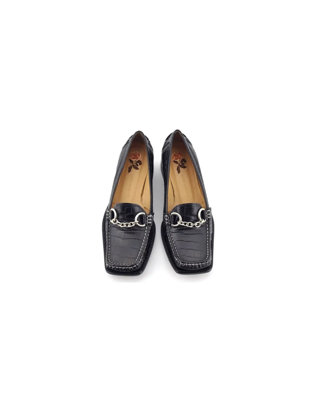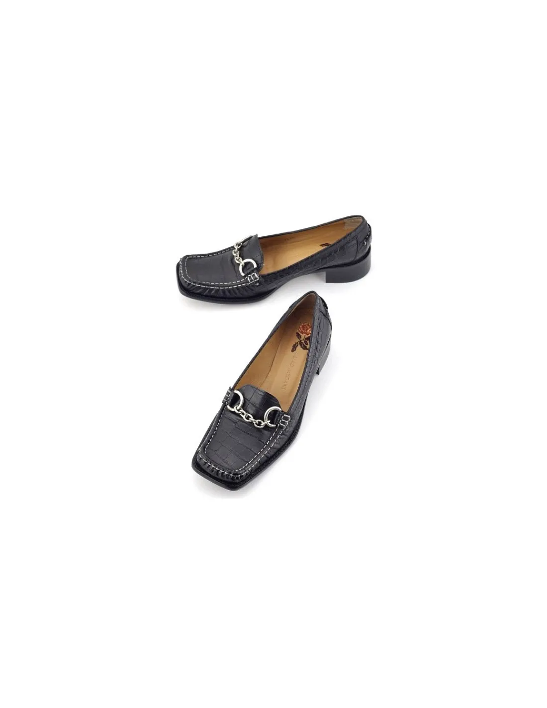 Te są ręcznie szyte, klejone wykańczane przez mistrzów sztuki szewskiej. Wykonane z czarnej skóry bydlęcej, miękkiej i mięsistej, tłoczonej na wzór skóry krokodyla. Szwy poprowadzone są na zewnątrz, dzięki czemu model ten jest bajecznie komfortowy. Szerokie, kwadratowe formy, nawet z lekkim przerysowaniem tej linii co doskonale podkreśla biała nitka stebnowania widoczna na przodach. Cholewka jest głęboko zabudowana, sięga do podbicia – jak na loafers przystało. Dla jej ozdoby zastosowano antykowany łańcuch w srebrnym kolorze (w rzeczywistości nie błyszczy się tak jak w lampach aparatu). Wkładki i futrówki wykonano ze skóry w naturalnym kolorze – ten rodzaj skóry jest niesłychanie miękki. Miękkość udało się ująć na zdjęciach.