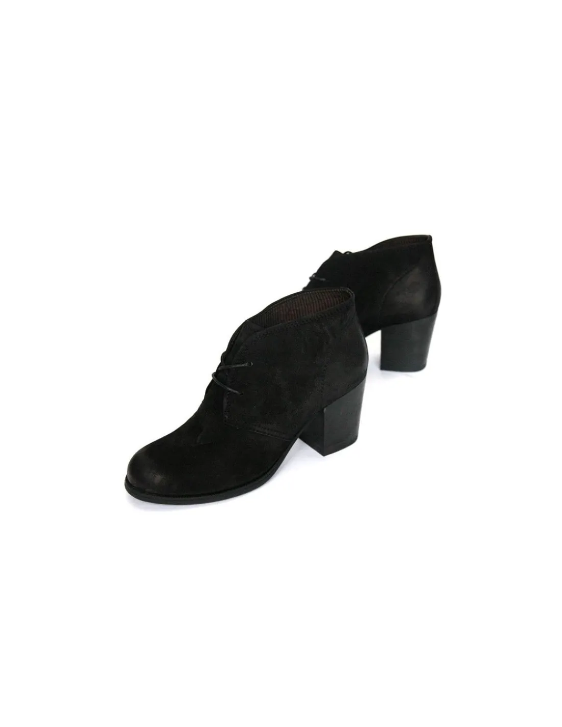 Trzewiki na stabilnym obcasie, takie co to zawsze do wszystkiego pasują. Linia prosta, klasyczna. Wykonane z niezwykle miękkiej skóry nubukowej w kolorze czarnym. Cholewka z dwurzędowymi sznurowadłami.