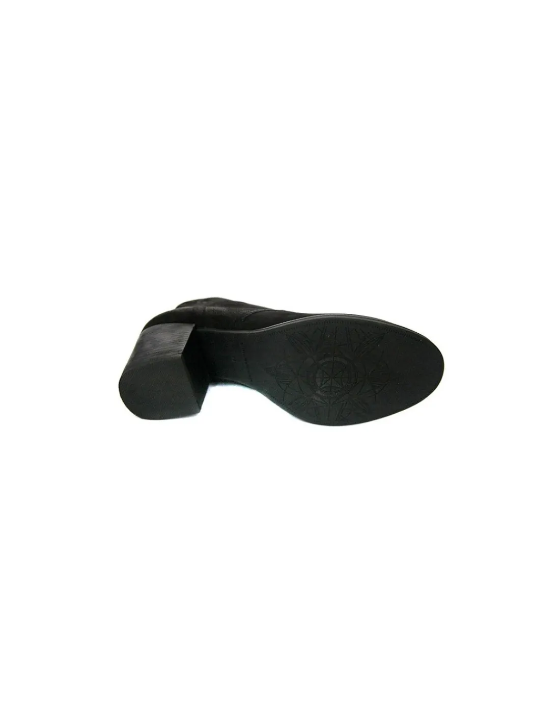 Skóra nubukowa, antykowana w stylu vintage na noskach i pietach. Taki rodzaj skóry możemy za pomocą pastowania i wypolerowania zamienić w skórę licową. W tylnej, górnej części cholewki wytłoczono dyskretnie logo marki. Obcas prosty w linii klocek w czarnych, skórzanych obłogach.
