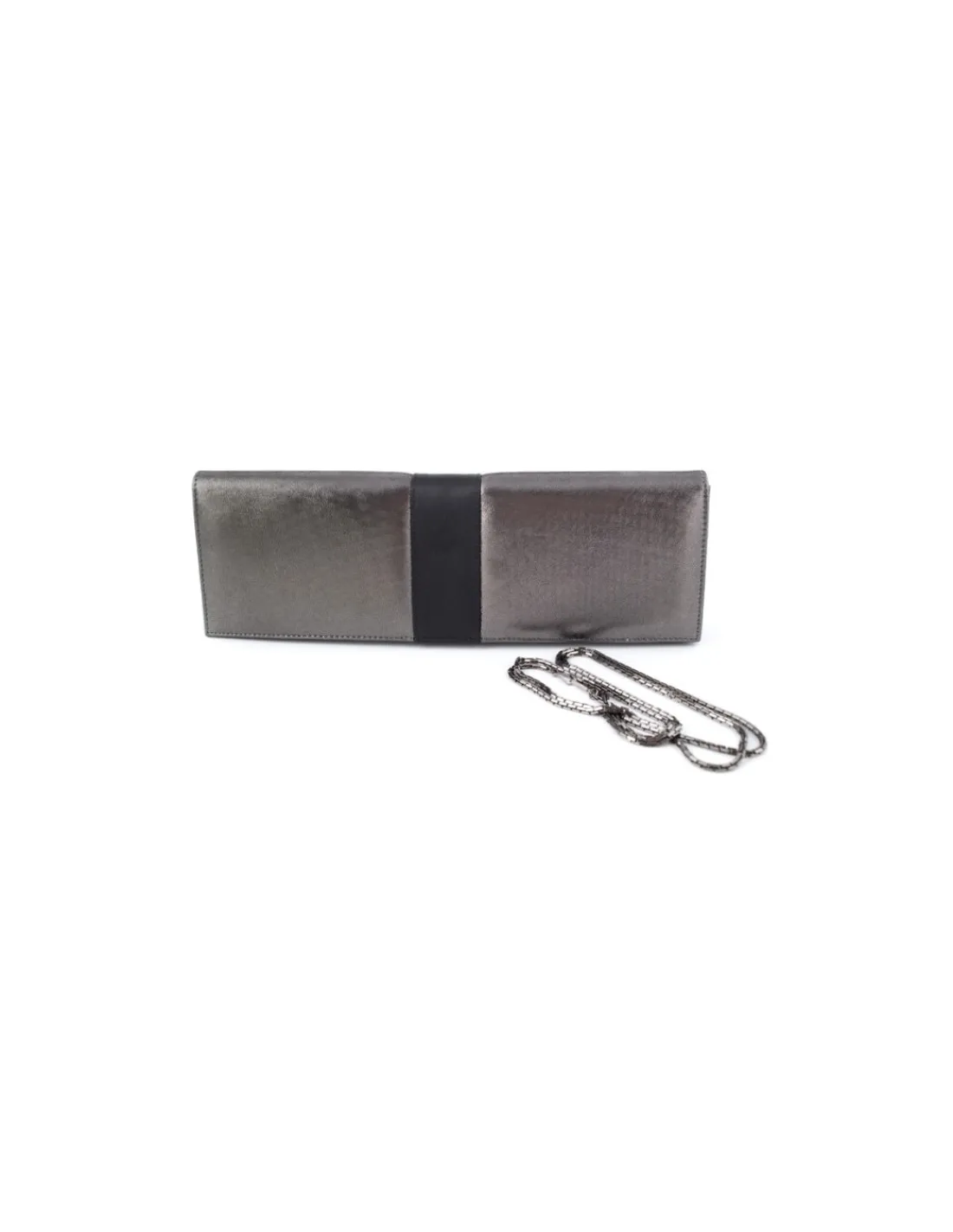Mała, wizytowa torebka usztywniona, w formie prostokątnej koperty. Została wykonana z najwyższej jakości naturalne skóry nubuk w kolorze ciemnego srebra lub nawet ołowiu. Przez środek klapy na przodzie przepasana czarną wstęgą z jedwabiu.