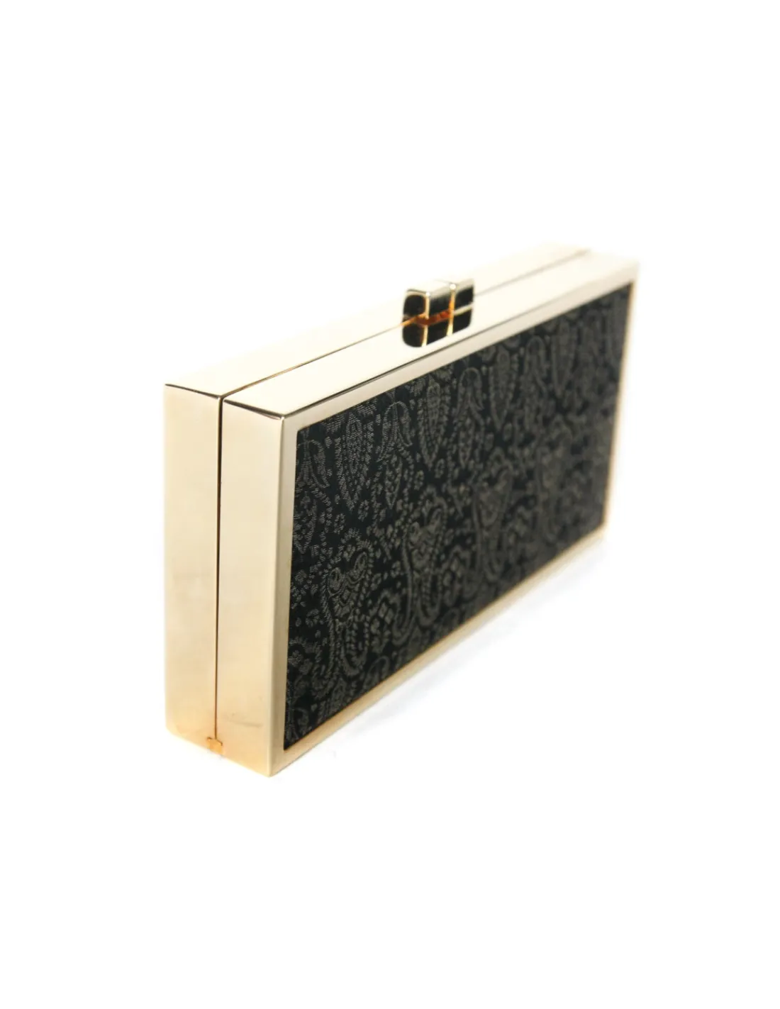 Została wykonana z najwyższej jakości, czarnej tkaniny – żakardu jedwabnego, przetykanego metaliczną nicią w kolorze złotym. Tkaniny techniczne są precyzyjnie dopasowane, zabezpieczone, całość dopracowana na najwyższym poziomie. Rama wykonana z metalu w kolorze złotym. Zapinana na bigiel. Wnętrze jednokomorowe, wykonane z tkaniny – jedwab w kolorze beżowo złotym.