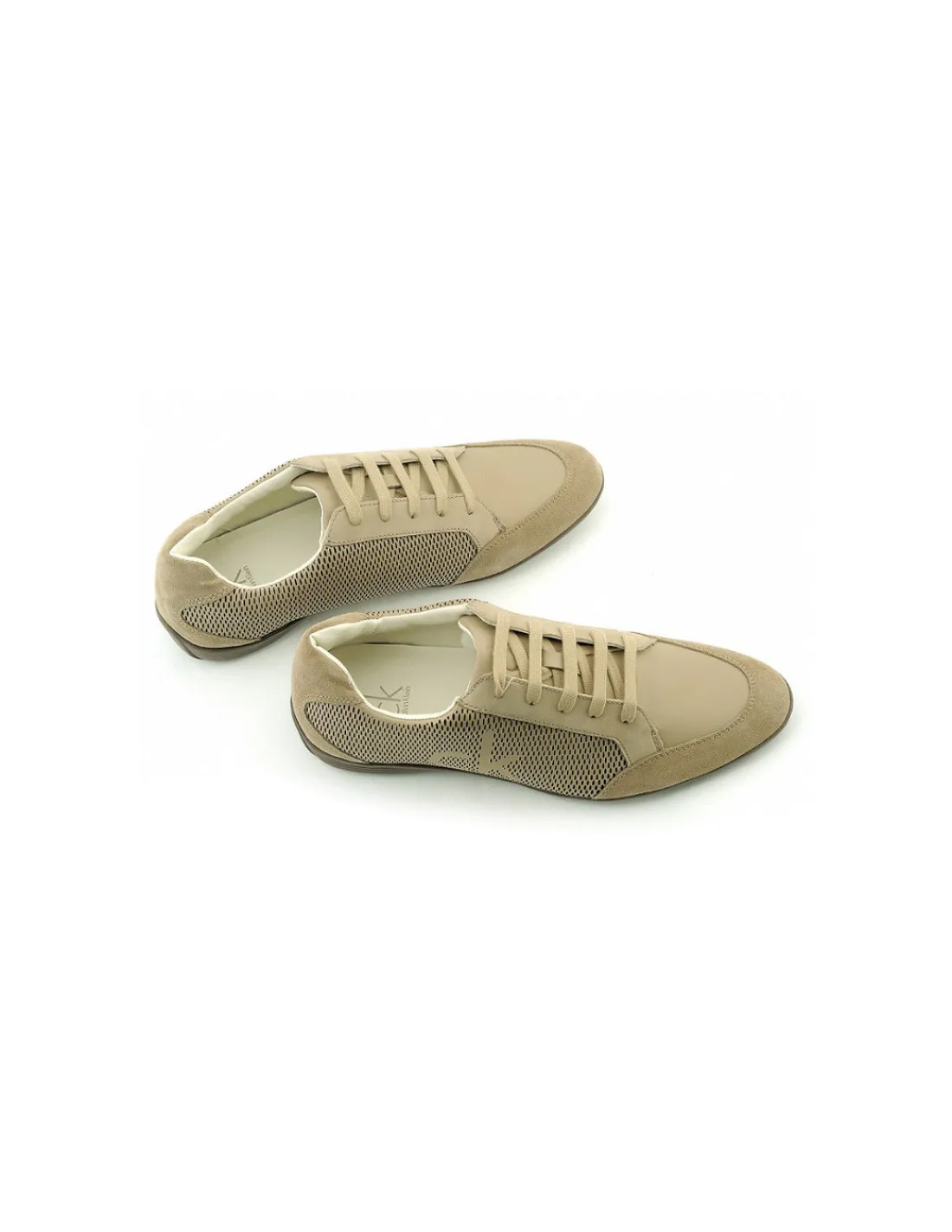 Wykonane z połączenia naturalnych skór: skóry licowej i skóry zamszowej. W bocznej części cholewki skóra licowa jest laserowo nacinana, tworząc logo marki CK . Ma to też swoje zamierzone właściwości , a mianowicie lepiej przepuszcza powietrze, więc dobrze sprawdza się w okresie wiosenno- letnim , bowiem „oddycha”. Całość utrzymana w jednej tonacji ciemnego beżu.