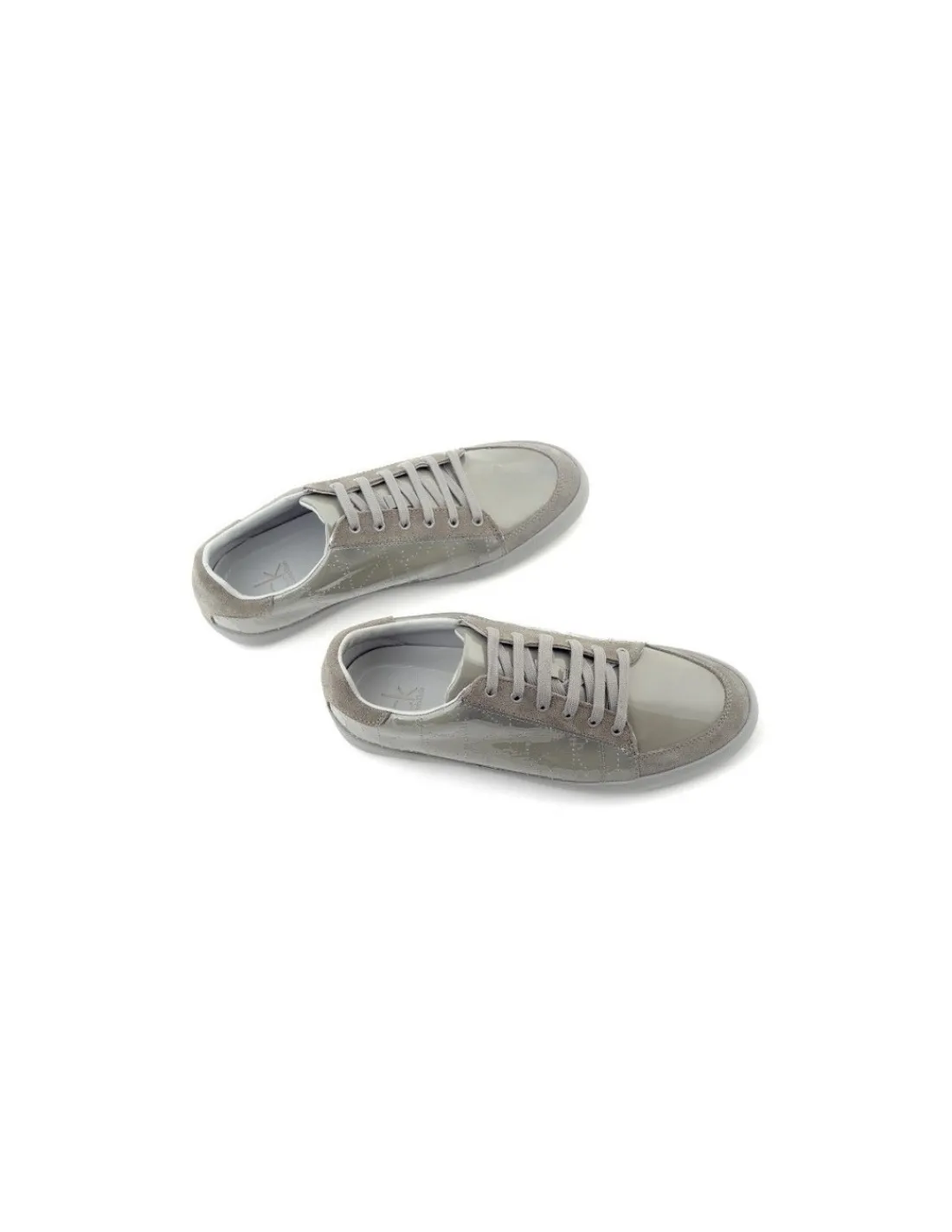 Wykonane z połączenia dwóch rodzajów skór – lakierowanej i zamszowej. Na bokach skóra została przeszyta nicią na wzór logo CK. Wokół cholewki jak na trampki przystało – gumowy otok również w szarym kolorze. Wewnątrz wkładki i futrówki skórzane.