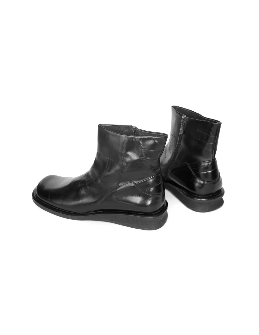 Czarna skóra polerowana, bez powłok lakierniczych. Forma tych botków to zdecydowany kwadrat z nieco zaokrąglonymi końcówkami – jest szeroka i komfortowa, przyjazna stopom każdego dnia i przez cały dzień. Rant zelówek wystaje po za obrys cholewek.