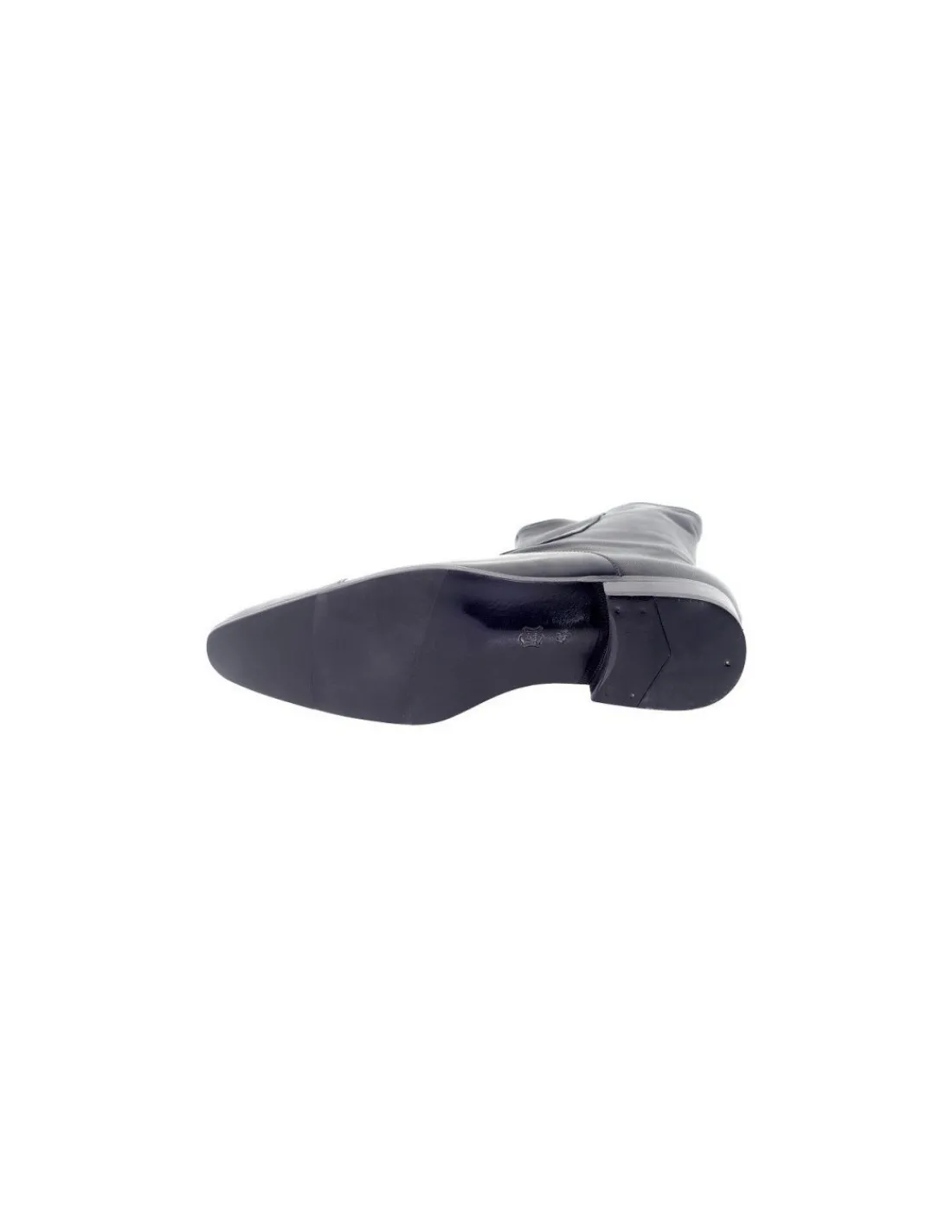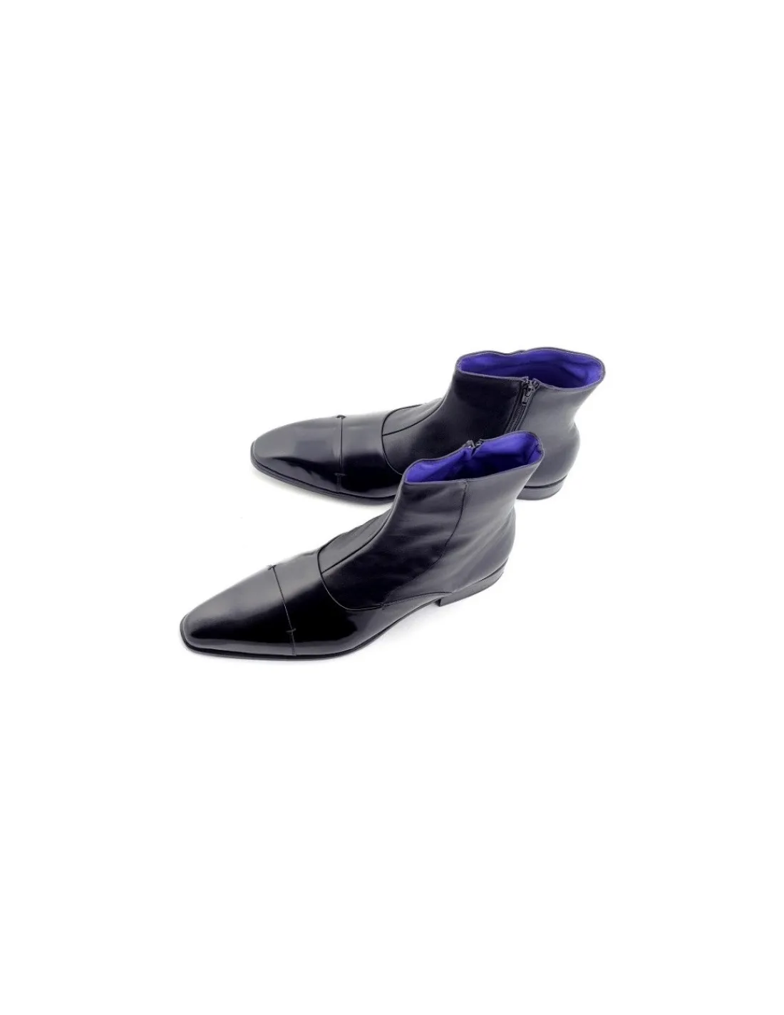 Całoroczne obuwie nad kostkę. Klasyczne w formie buty, których dolna część cholewki wykonana jest z czarnej skóry polerowanej (antik) z zadziornym nosem, na kształt i podobieństwo półbutów typu cap toe. Górna część cholewki to miękka, mięsista skóra z cielaka również czarna.