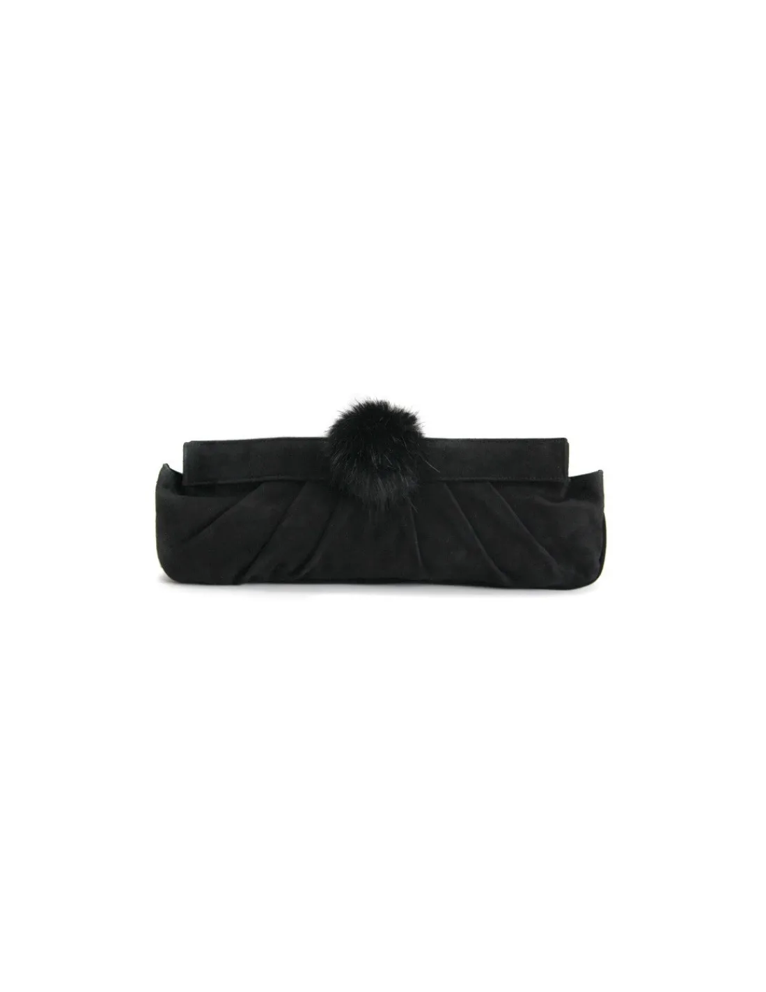 Mała, wizytowa torebka, usztywniona, w formie prostokątnej, z zaokrąglonymi bokami koperty. Wykonana z najwyższej jakości, czarnej, delikatnej , aksamitnej w dotyku skóry zamszowej. Przód torebki ozdabia marszczona skóra co zdecydowanie dodaje jej uroku kobiecości. Nad drapowaniem umiejscowiony czarny pompon z norki – świetne połączenie i naprawdę unikatowy, przykuwający uwagę dodatek. Główna komora zamykana na dwa magnesy, zatrzaski. Wnętrze jednokomorowe. Na jednym z boków mała kieszonka zapinana na zamek.