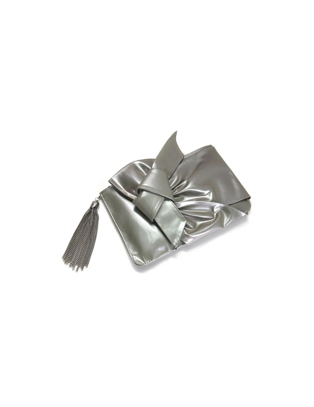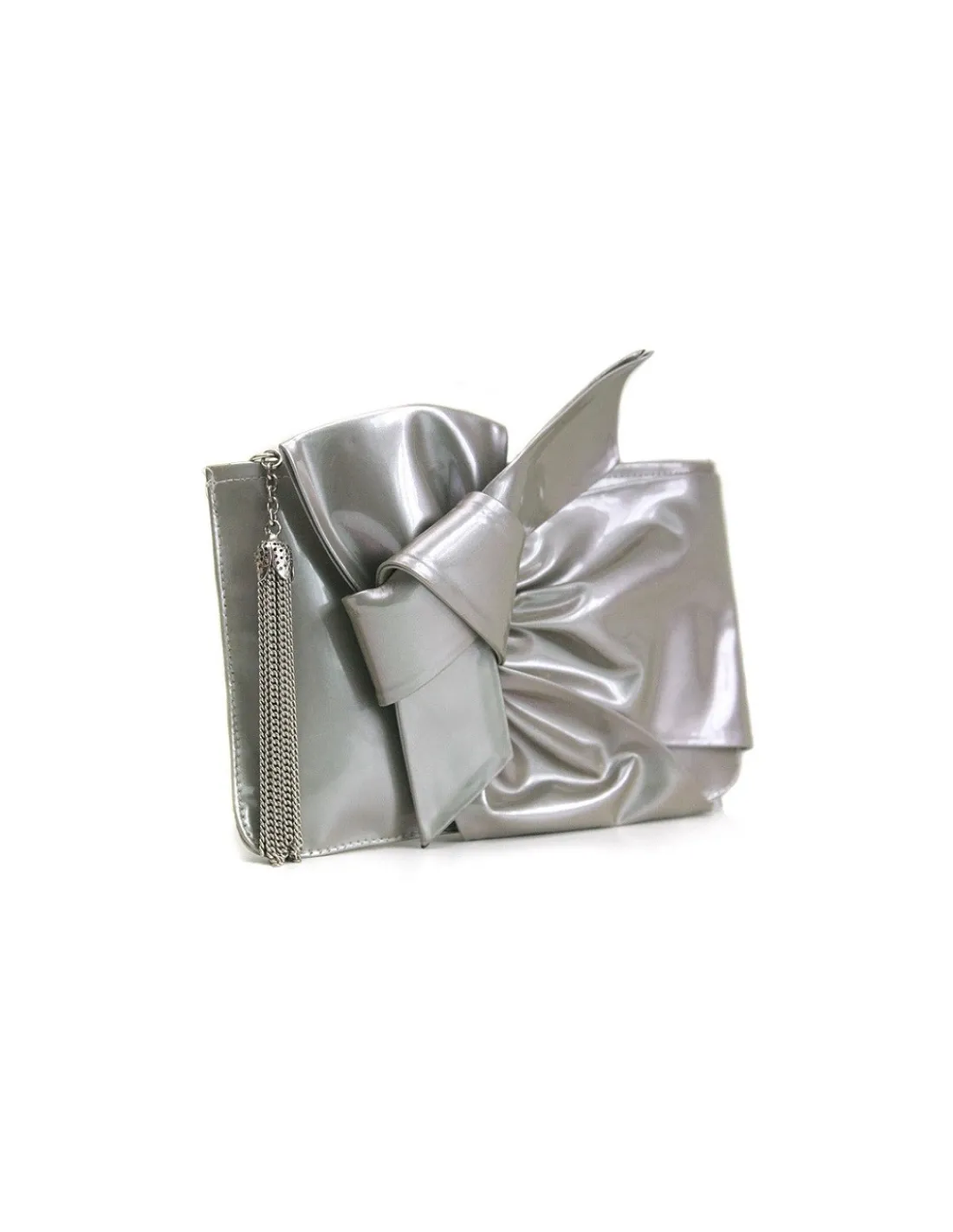 Mała, wizytowa torebka, kopertówka wykonana z naturalnej skóry lakierowanej w kolorze perłowo – szarym metalicznym odcieniu. Torebka pięknie wygląda noszona w dłoni, jest skonstruowana w taki sposób, że rękę można włożyć pod kokardę. Główna komora zamykana na zamek, do którego doczepiono duży, metalowy brelok z frędzlami (nie ma problemu z odczepieniem ozdoby).