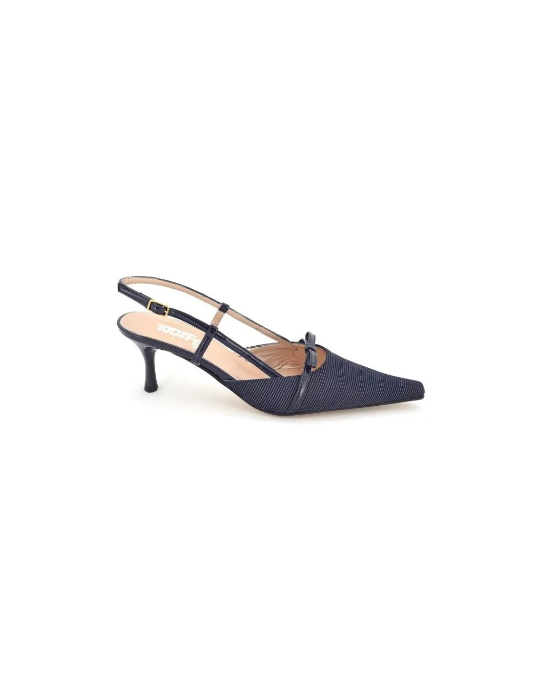 Ciekawa, prosta forma, lekko zwężona zakończona w szpic na niewysokich szpilkach z granatowego tworzywa z połyskiem. Paseczki na piętach z regulacją małą, złotą klamerką. Wygodne i lubiane przez wiele Klientek.