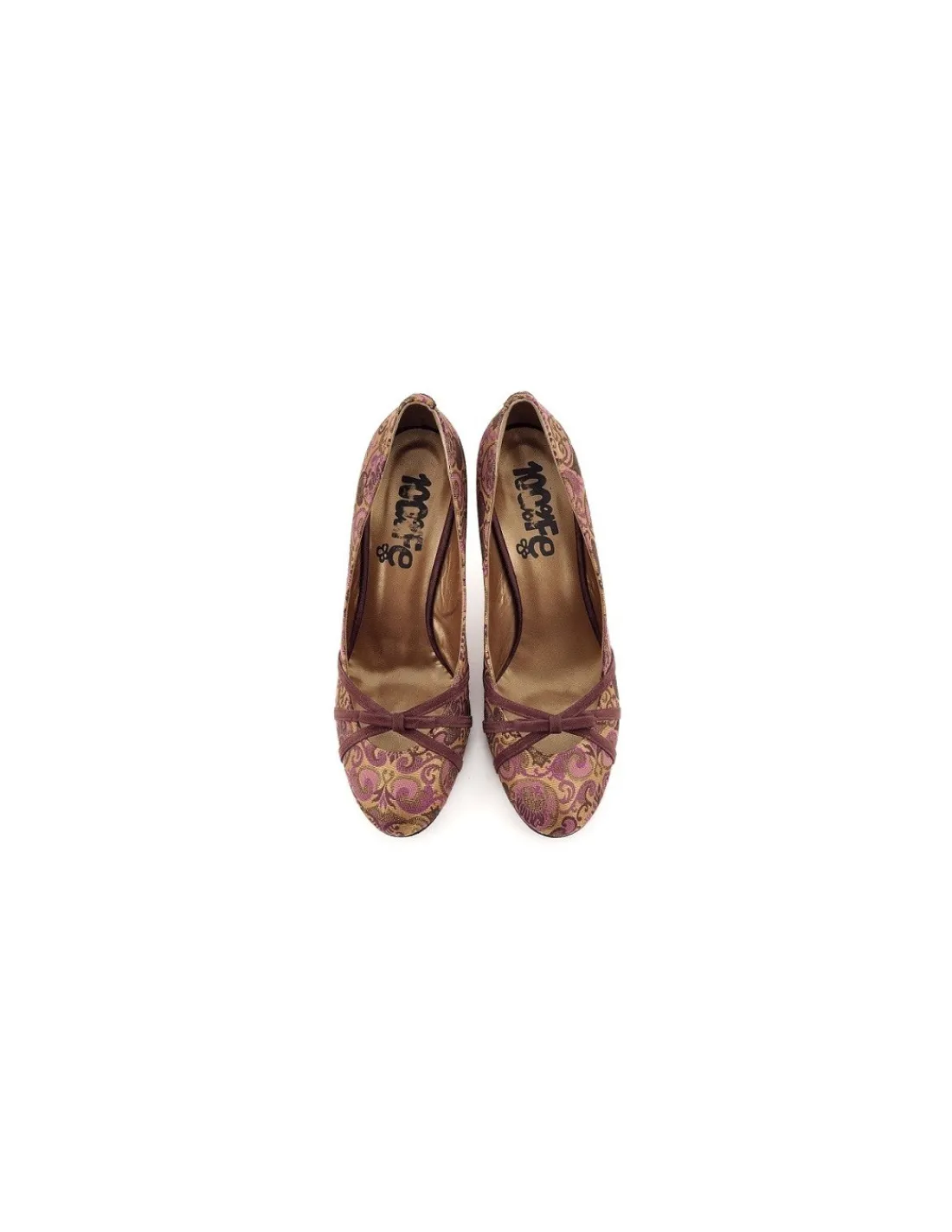 Ozdobę w przedniej części stanowią 3 paski ze skóry zamszowej stonowanej z kolorystyką tkaniny, zebrane w niewielką kokardkę. Buty zachowują prostą, okrągłą formę, nie maja żadnych cięć, a ich okrągły nosek wprowadza nas w świat „baby doll”. Na stopach prezentują się niezwykle efektownie, klasycznie, elegancko i z pazurem.