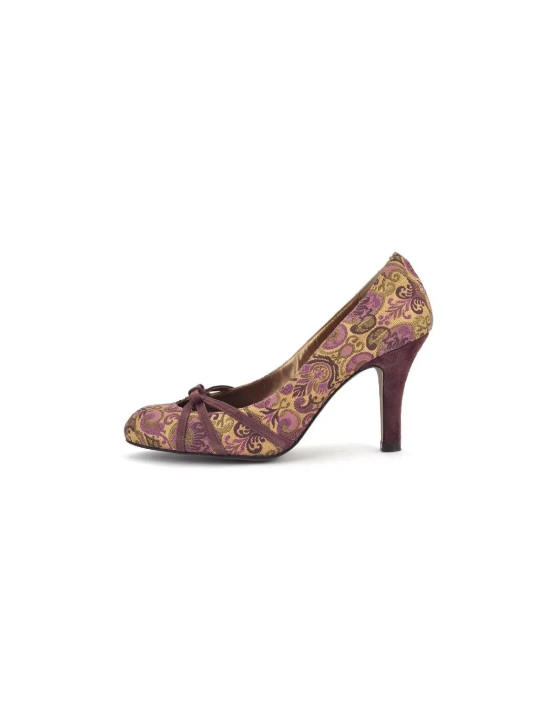 Proste, klasyczne, a jednocześnie wyjątkowe. Wykonane ze starannością w każdym detalu z żakardowej tkaniny z barokowym wzorem, utrzymanej w kolorystyce fioletu, bakłażana i starego złota.