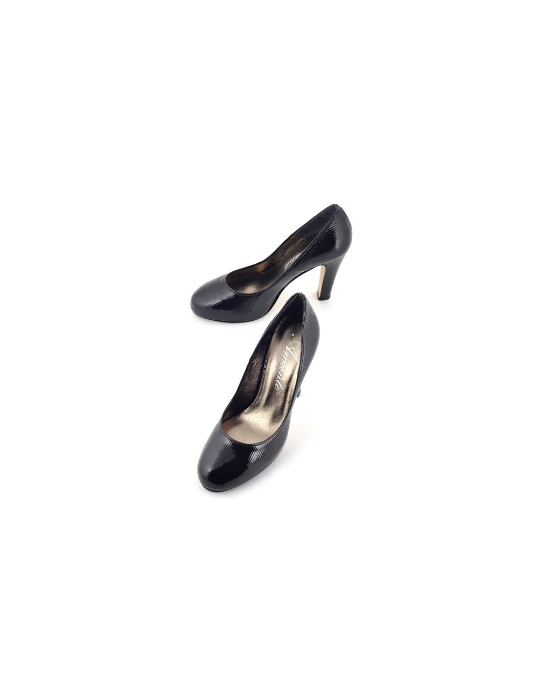 Wykonana z najwyższej jakości, czarnej skóry lakierowanej z tłoczoną strukturą drobnych prążków idących równo, wzdłuż linii czółenek. Forma czółenek okrągła, komfortowa, ergonomiczna, noski podniesione. Wewnątrz wkładki i futrówki z bardzo miękkiej skóry licowej w metalicznym kolorze.