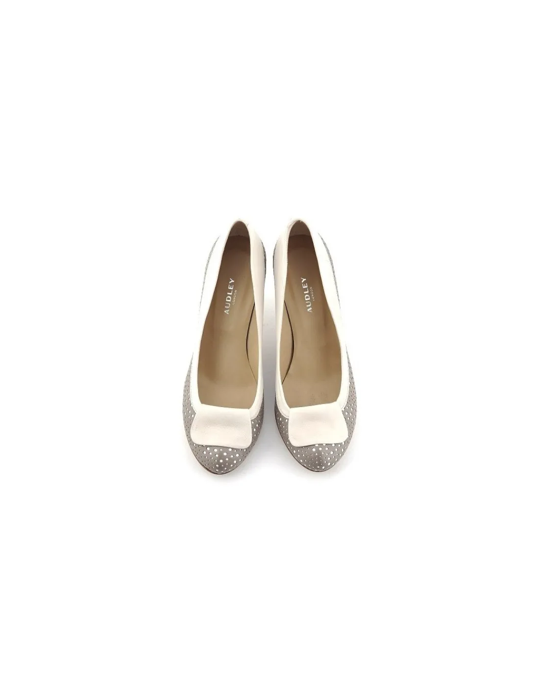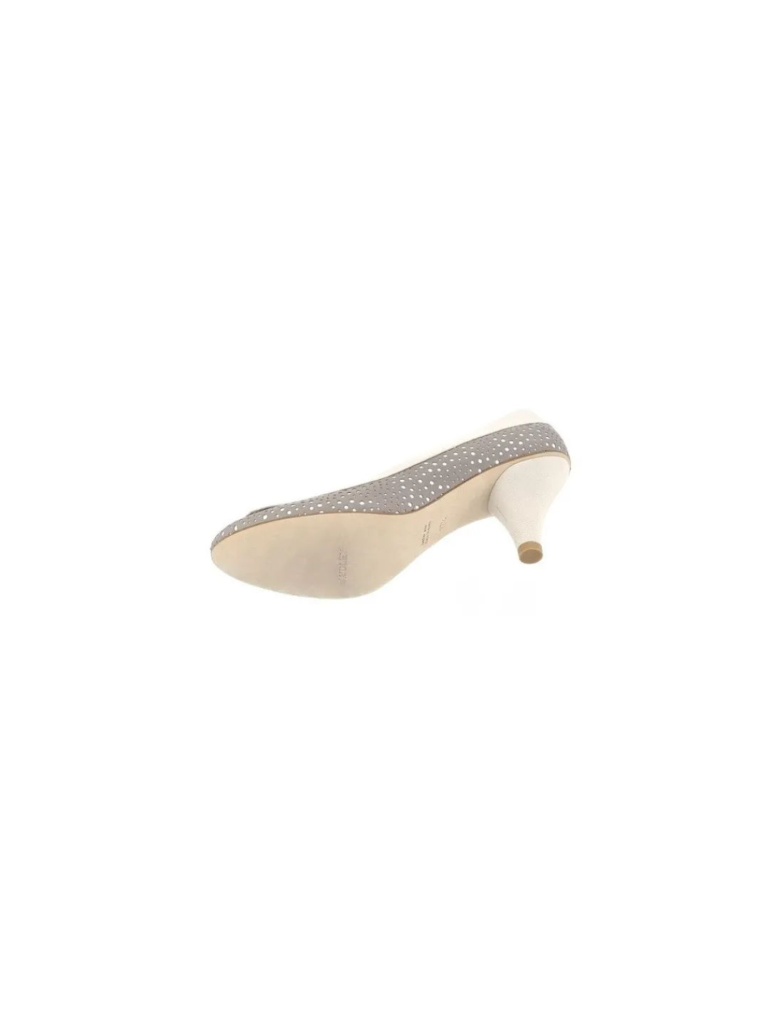 Wykonane z najwyższej jakości naturalnych skór w 2 kolorach. Czółenka utrzymane są w jasnej, pastelowej kolorystyce. Interesujące połączenie z tonacją letniego outfit – ciemniejszy odcień to beż z kroplą szarości, jaśniejszy to ecru. Świetny pomysł z zastosowaniem dwóch skór w tym zestawie powoduje, że otrzymujemy czółenka w groszki. Powstały one dzięki nałożeniu ciemniejszej skóry perforowanej w nierównej wielości otworki na jaśniejszą skórę, która wyraźnie przebija. Wnętrze, czyli zarówno futrówki jak i wkładki wykonane są z naturalnej skóry.