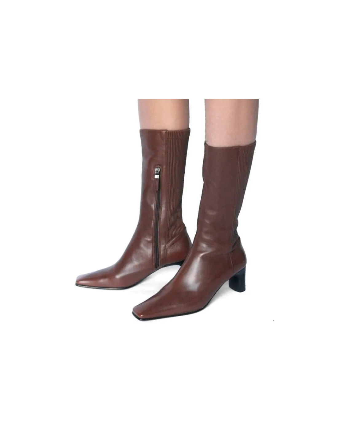 Forma nosków wydłużona, ścięta w kwadrat. Zapinane na zamki po stronie przyśrodkowej. W tylnej części cholewek skóra została przeszyta, a jej „nadmiar” tworzy wąskie, pionowe pasma. To rozwiązanie jest świetnie przemyślane, jeśli jest taka potrzeba cholewki w tym miejscu rozciągają się, a pionowe pasma zebranej skóry prostują się (napinają).