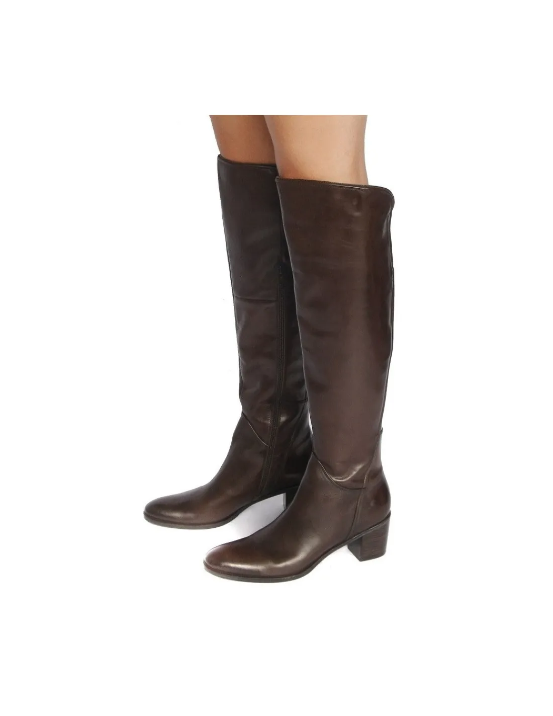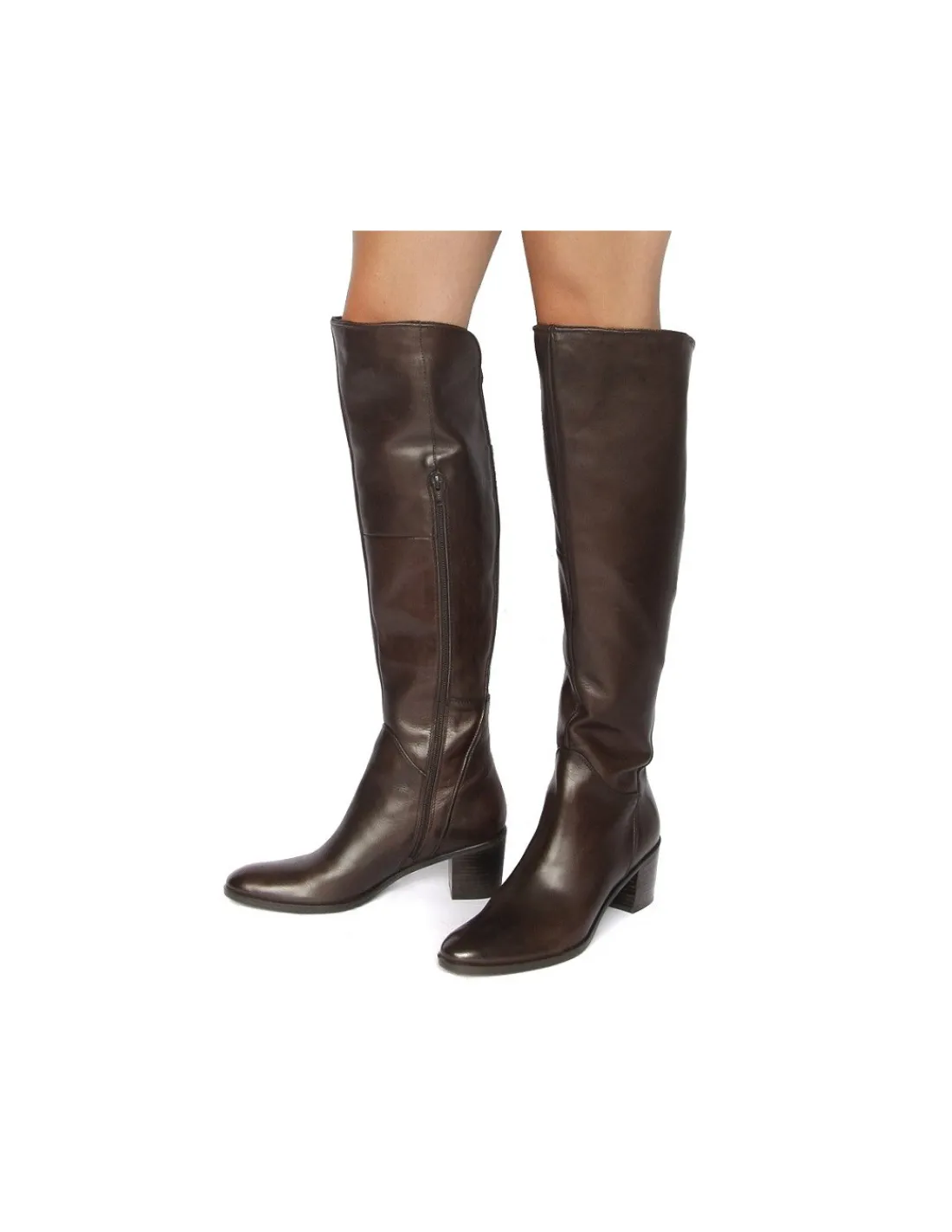 Efektowne kozaki wykonane z mięsistej, miękkiej skóry licowej – bydlęcej w kolorze brązowym. Cholewka w zależności od długości Twoich nóg sięga na lub nad kolano. Zapinana na zamek po stronie przyśrodkowej.