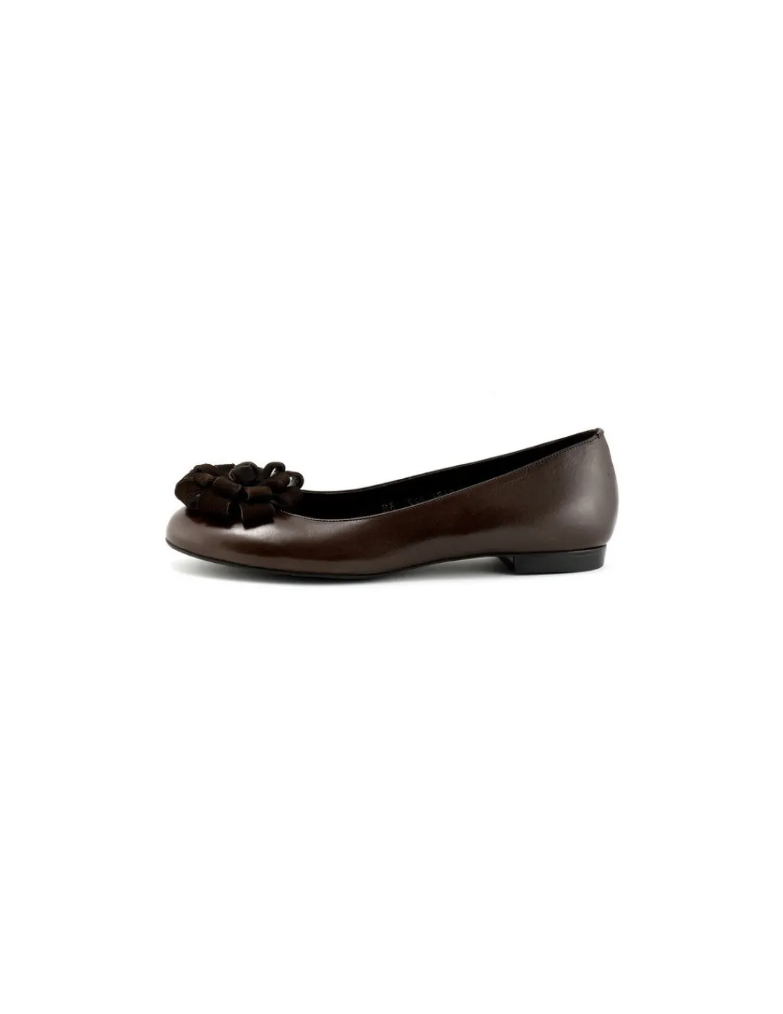 Te zostały wykonane z miękkiej skóry nappa w pięknym odcieniu czekoladowego brązu. Dodatkowym, ciekawym elementem jest ozdoba w formie kwiatów wykonana ręcznie ze skóry zamszowej, również brązowej. Wewnątrz wyściółki i futrówki wykonano ze skóry cielęcej. Zelówki wykonano z cienkiej logowanej gumy. Ten rodzaj wykończenia sprawia, że świetnie amortyzują nierówności miejskich chodników, nie chłoną też wilgoci.