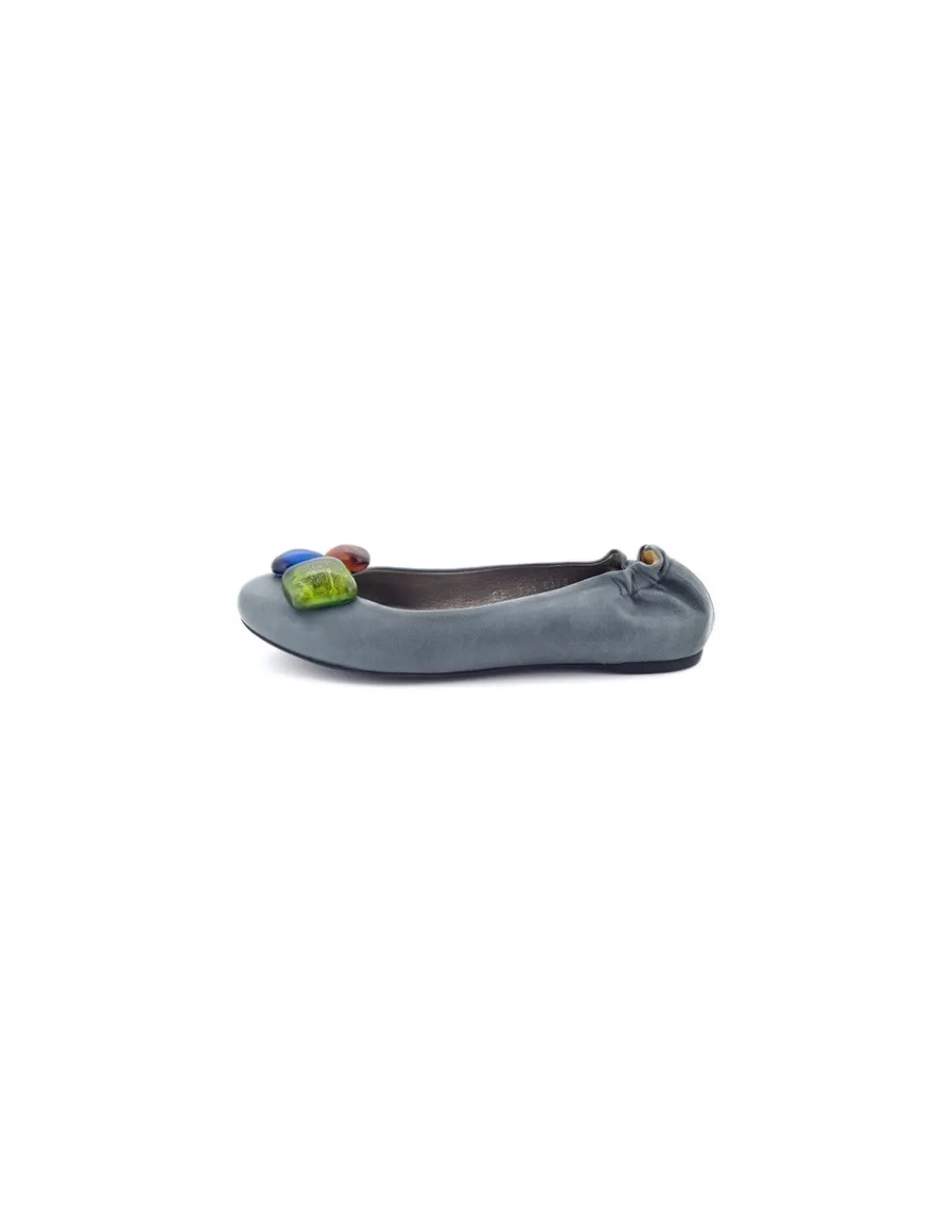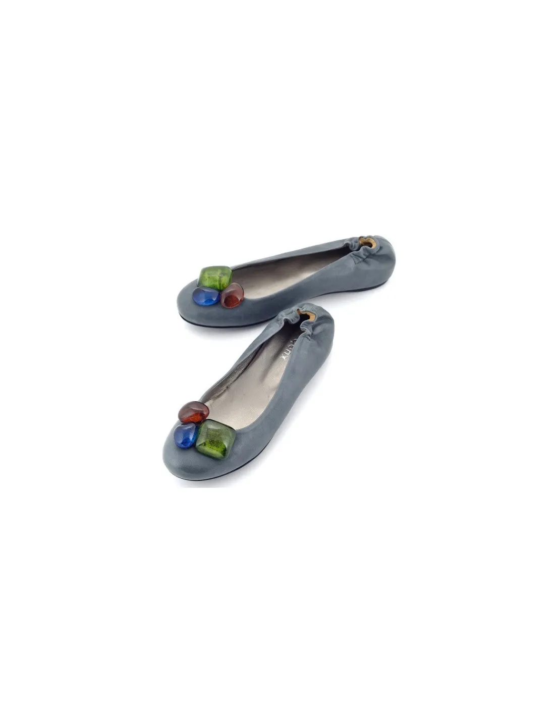 Te zostały wykonane z miękkiej skóry nappa w szaro- niebieskim kolorze. Dodatkowym, ciekawym elementem jest ozdoba na nosku, w formie trzech dużych, transparentnych kamieni w kolorze indygo, bursztynowym i zielonym. Wewnątrz – wkładki i futrówki wykonano ze skóry cielęcej. Miękkość skór udało się ująć na zdjęciach.