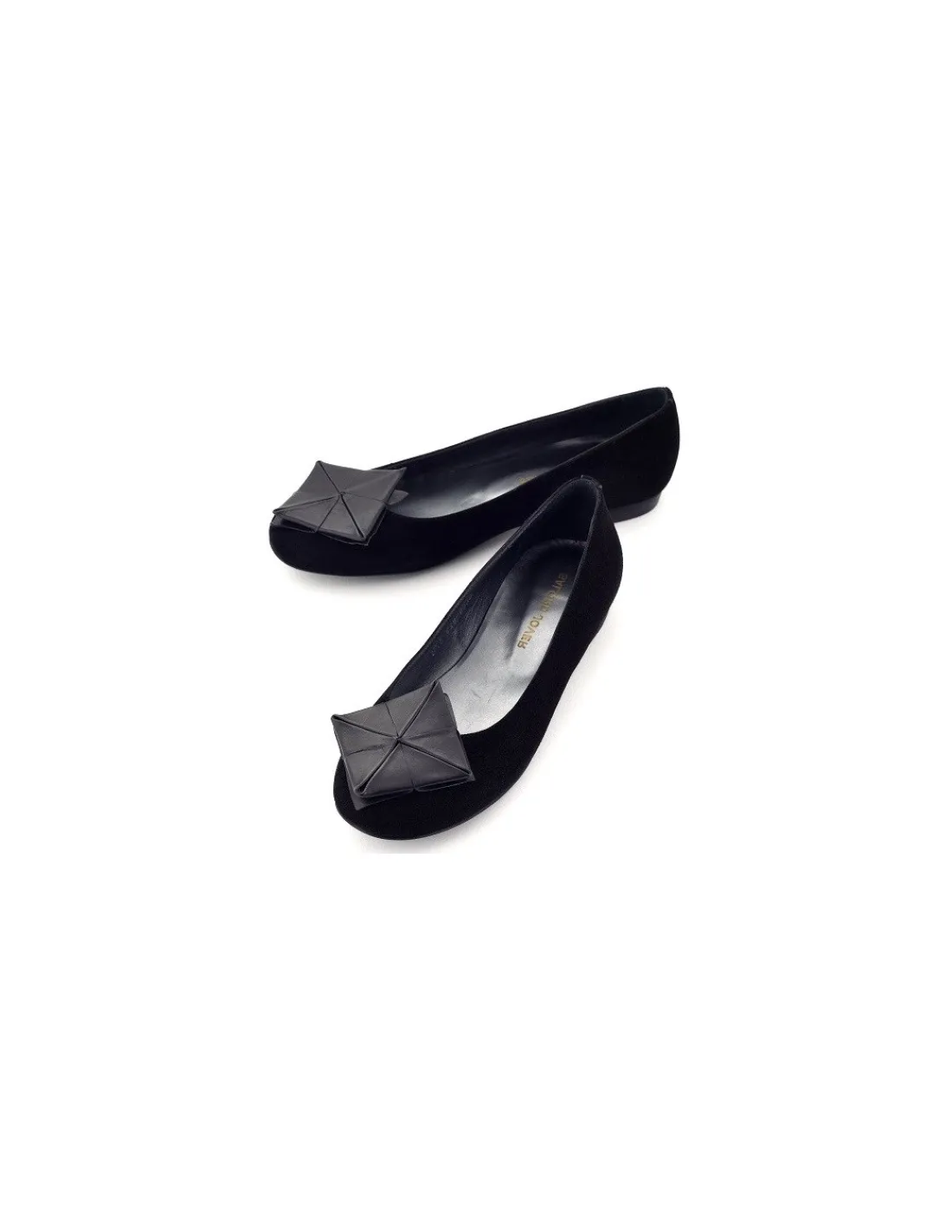Te zostały wykonane z miękkiej, naturalnej skóry zamszowej w czarnym kolorze. Ciekawym elementem jest ozdoba w formie kwadratu przypominającego składankę z czasów dziecięcych zabaw w „piekło niebo”- pamiętacie ? Lecz zamiast z papieru wykonana jest ze skóry licowej, lekko błyszczącej dla kontrastu z piękną, głęboką czernią zamszu. Wewnątrz – wkładki i futrówki wykonano ze skóry cielęcej w ciemnym, metalicznym kolorze.