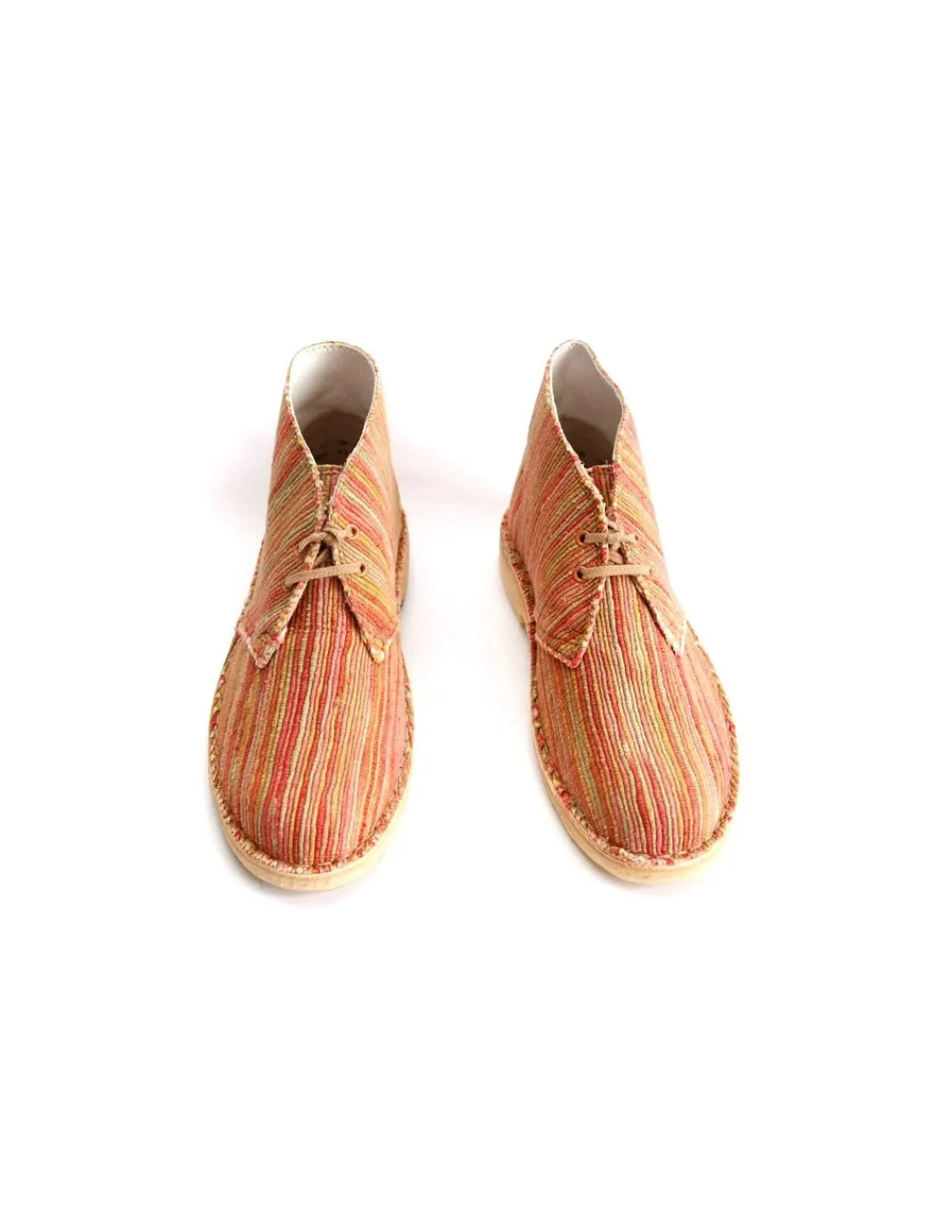 Wygodne i bardzo praktyczne buty, są obecnie kultowym modelem marki. Ten model wykonano z specjalnego materiału utkanego na zlecenie dla Original’s z cienkich, kolorowych paseczków. Wkładki skórzane, futrówki z tkaniny bawełnianej. Buty sznurowane na dwie dziurki – dość wysoko, sznurowadłem bawełnianym w beżowym kolorze.