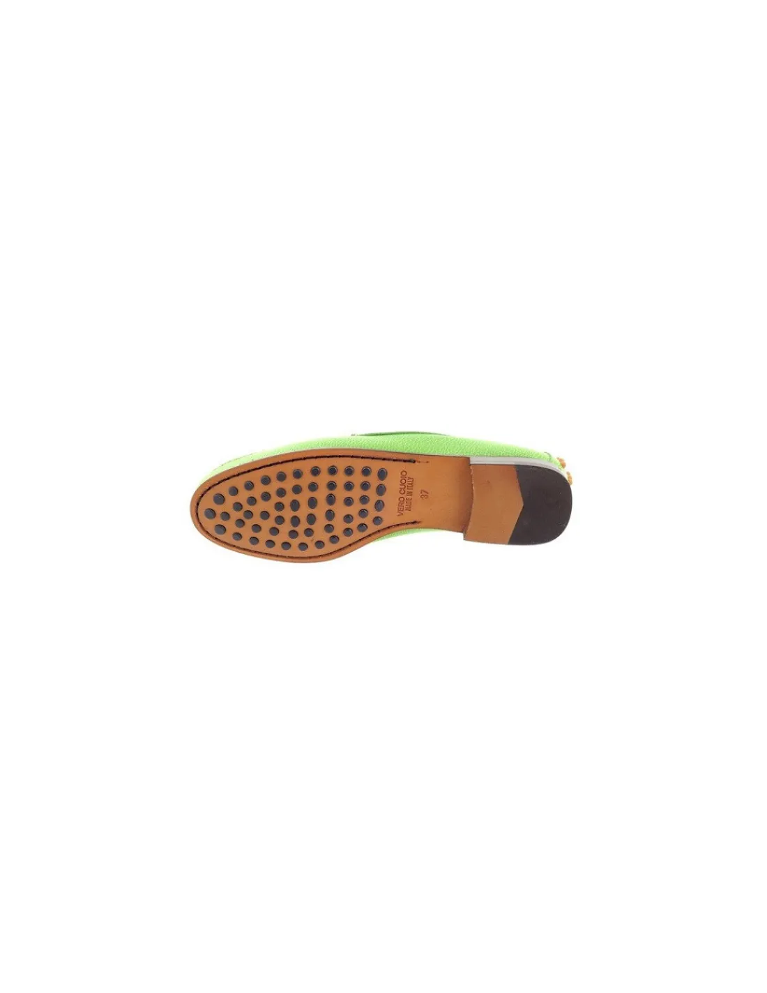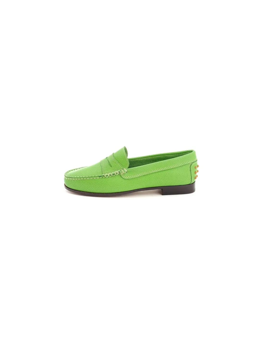 Wykonane są z jednego kawałka naturalnej, strukturalnej skóry bydlęcej w kolorze zielonego groszku, lub letniej świeżej zieleni. Jest to skóra groszkowa i ma charakterystyczne, malutkie, chropowate kropeczki. Podeszwa i boki mokasynów stanowią całość, dopiero później doszywana jest górna część cholewki i skórzane zelówki typu car shoes. Szwy poprowadzone są na zewnątrz, dzięki czemu model ten jest bajecznie komfortowy. Te mokasyny nie posiadają futrówek, wierzchnia część cholewki jest pojedynczą skórą, a wnętrze to jej lewa strona. Takie rozwiązanie sprawia, że o wiele lepiej się dopasowują. Są miękkie i lekkie. Wyściółki skórzane.