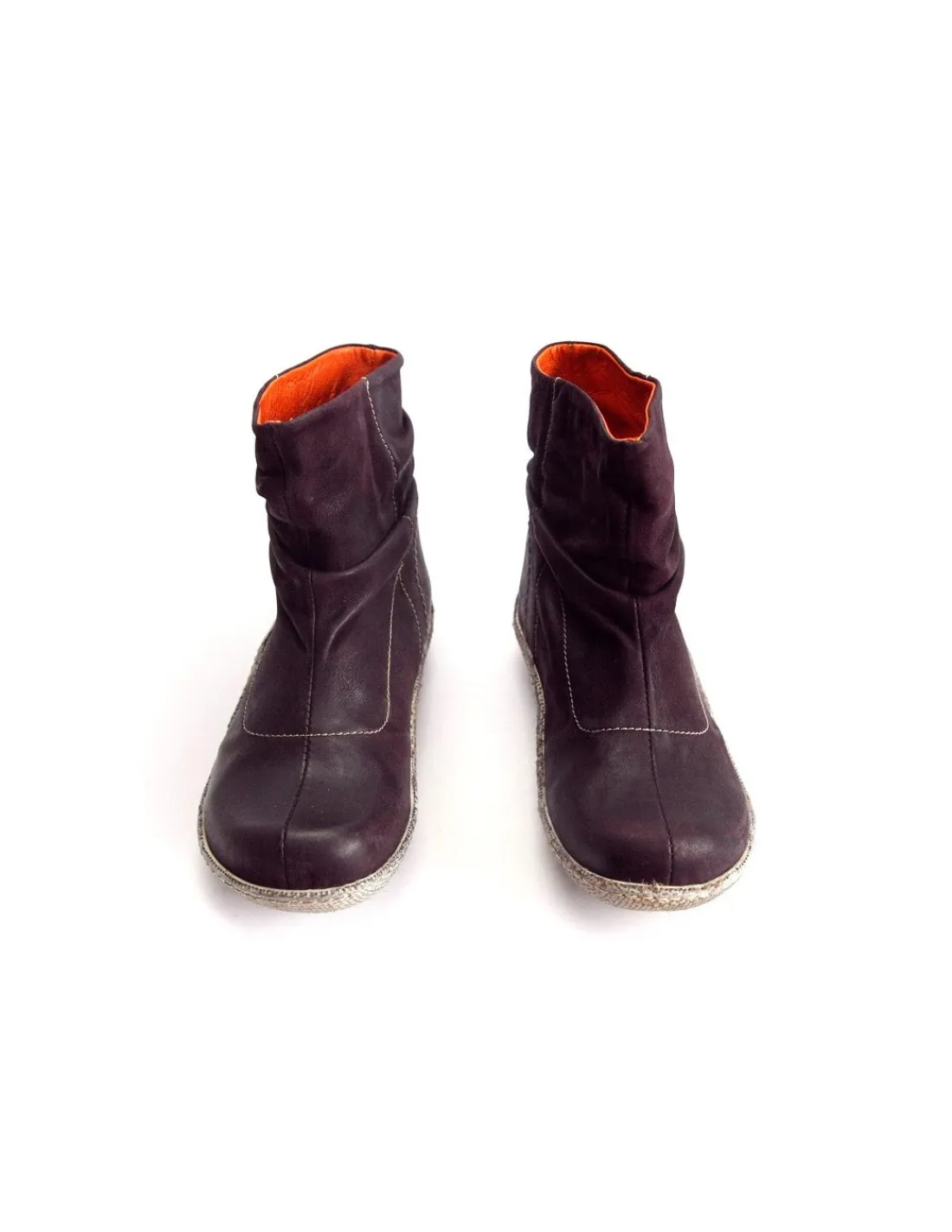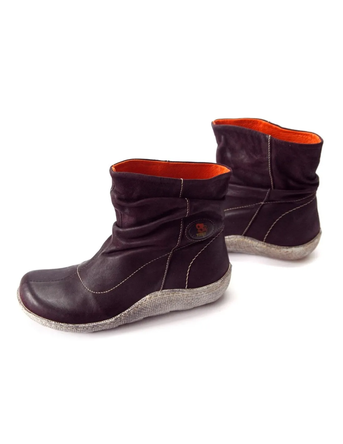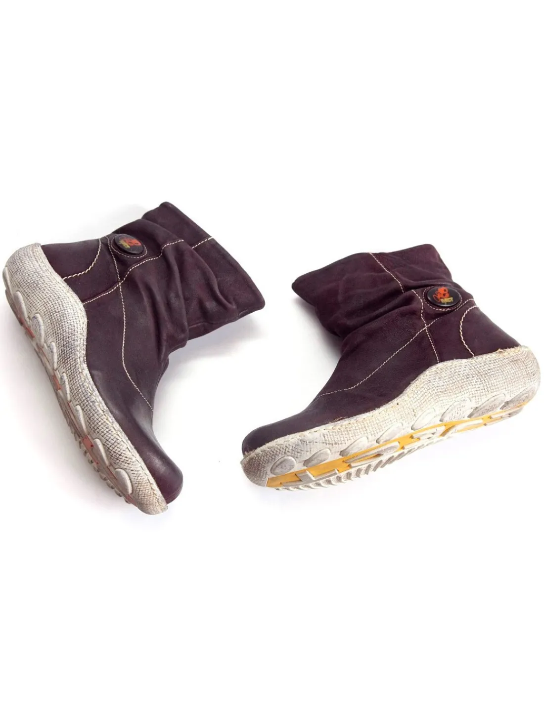 Botki wykonane z najwyższej jakości skóry nubukowej w głębokim kolorze bakłażana. Skóra jest postarzana z efektem vintage, w górnej części cholewki nieco marszczona. Wciągane w oka mgnieniu i bez zamka, krótkie nieco powyżej kostek. Interesującym elementem są efektowne, długie, logowane getry, które zupełnie zmieniają wygląd oraz funkcję tych botków.
