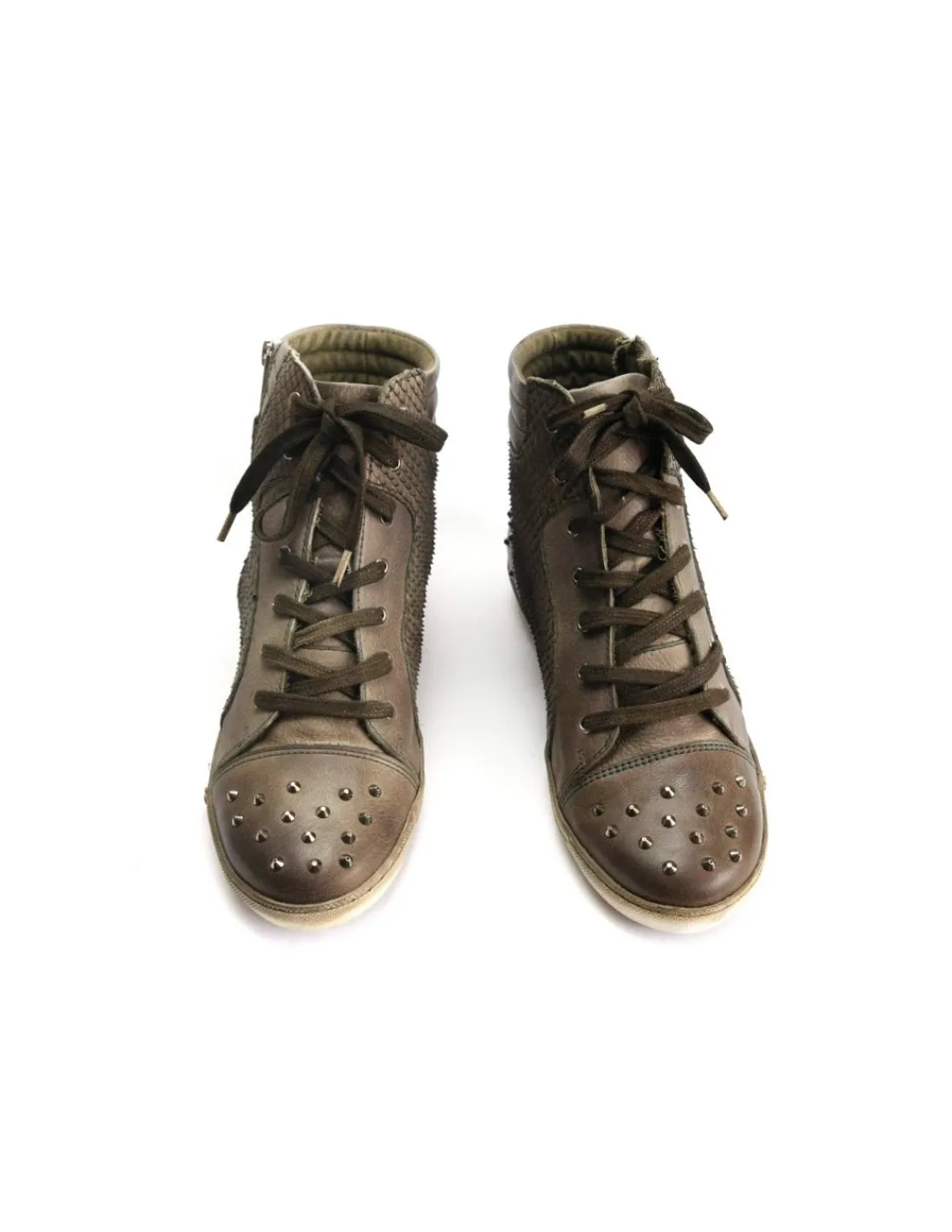 Na bocznych częściach cholewki skóra licowa została laserowo nacięta na wzór skóry węża. Całość dopełniają ćwieki zamontowane na piętach i noskach.