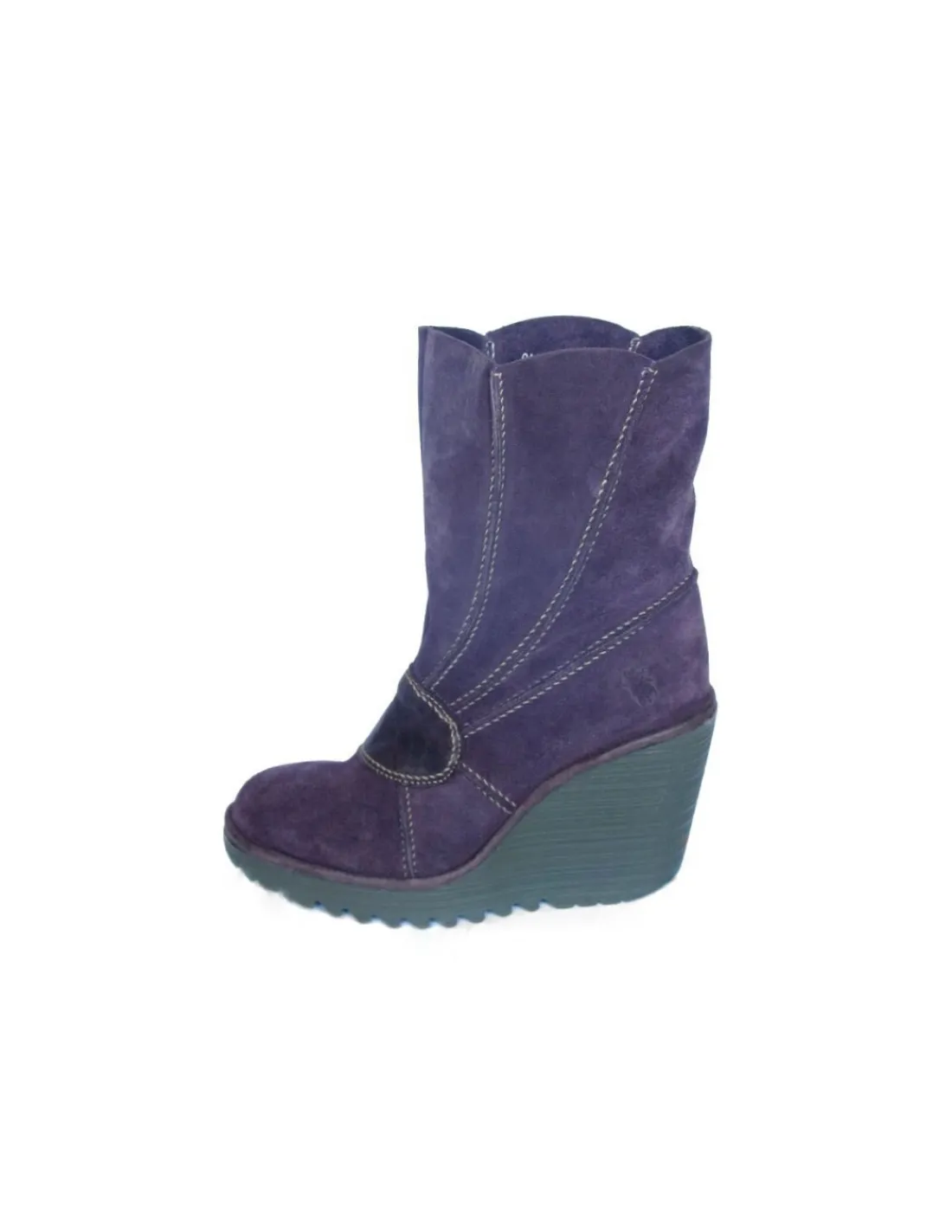Botki wykonane z naturalnej skóry zamszowej w kolorze fioletowym. Wykończenia, lamówki ze skóry licowej również w dopasowanym kolorze fioletu.