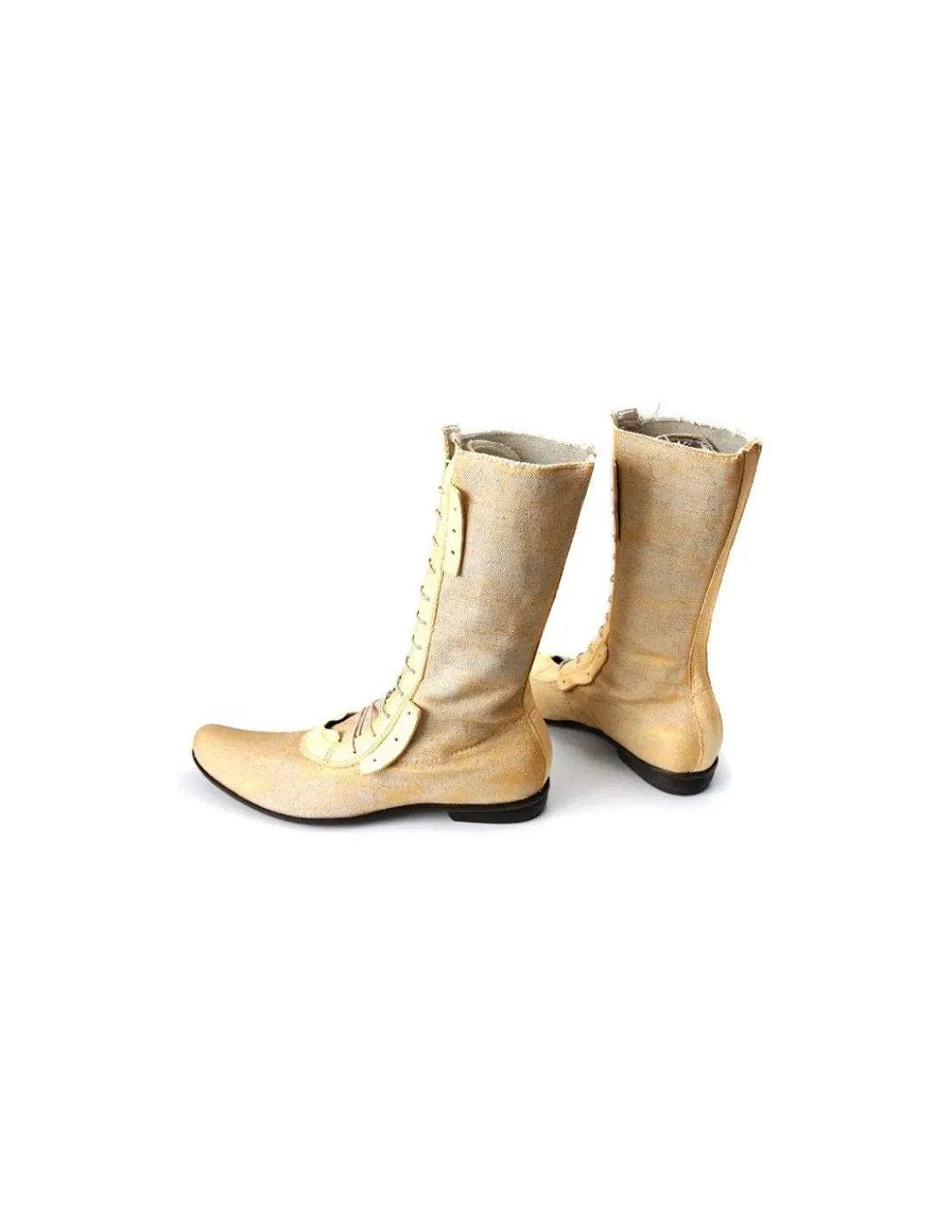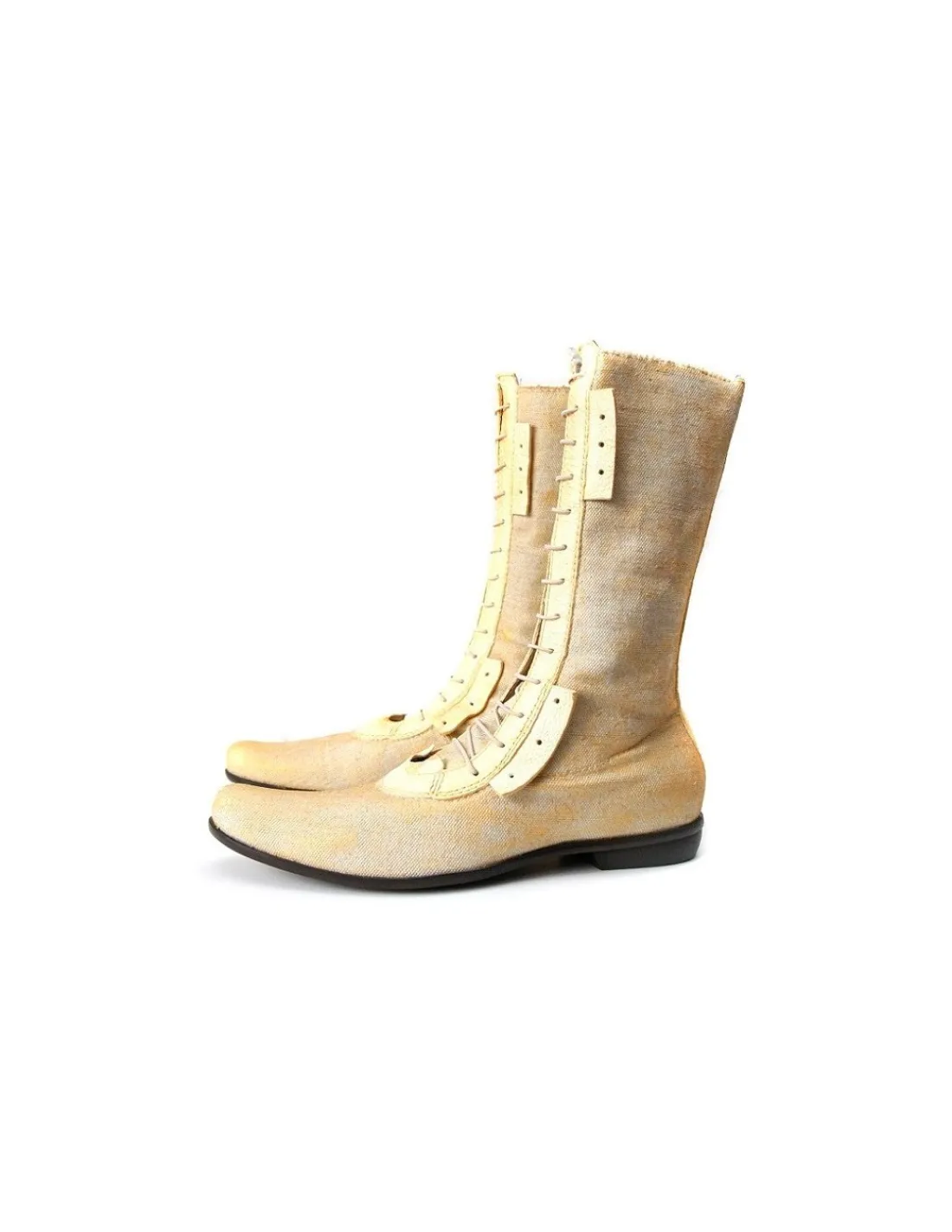 Ta tkanina ulega niewielkiemu naciąganiu ponieważ jest wyprodukowana w połączeniu ze stretchem. Wykończenie cholewki w stylistyce vintage, celowo lekko snujące się. Wnętrze obuwia do wysokości kostek oraz język wykonane zostały z naturalnej skóry w kolorze écru.