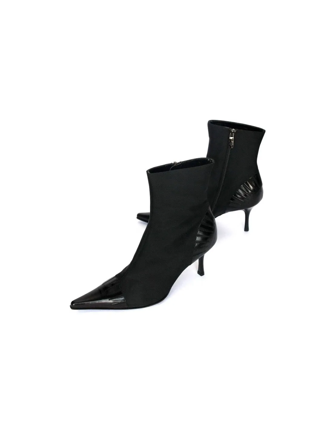 Noski i za piętki wykonano z czarnej skóry licowej polerowanej, z połyskiem co w widoczny sposób odcina się optycznie. Jest to bardzo przemyślany zabieg – wstawiono ją w tych newralgicznych miejscach jako dodatkowe zabezpieczenie przed ewentualnymi uszkodzeniami mechanicznymi , otarciami , czy po prostu przed wilgocią. Forma botków wysmuklona, a noski zakończone w szpic.