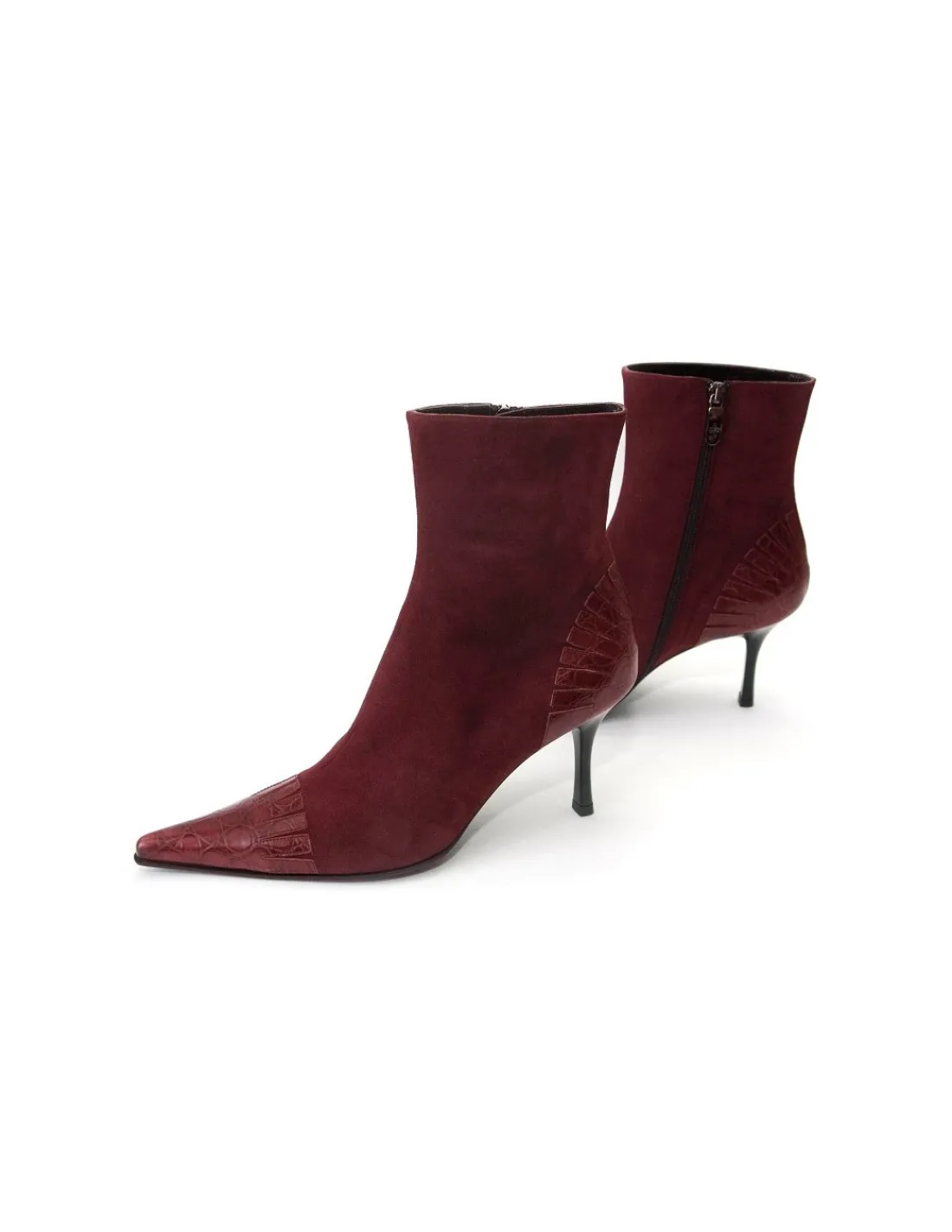 Noski i za piętki wykonano z bordowej skóry licowej z tłoczonym wzorem croco. Jest to bardzo przemyślany zabieg – wstawiono w tych newralgicznych miejscach skórę jako dodatkowe zabezpieczenie przed ewentualnymi uszkodzeniami mechanicznymi , otarciami , czy po prostu przed wilgocią. Forma botków wysmuklona, a noski zakończone w szpic.