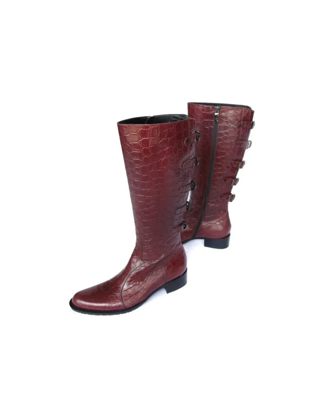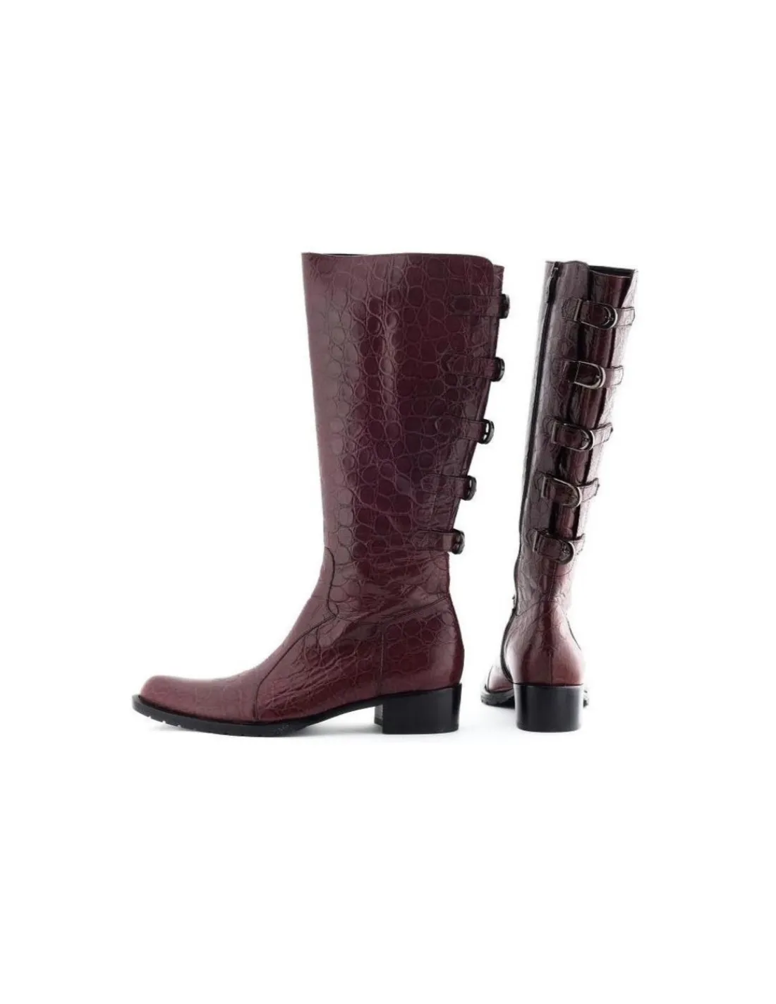 Kozaki wykonane z najwyższej jakości, miękkiej skóry bydlęcej, licowej w kolorze bordo. Skóra tłoczona na wzór aligatora, a następnie polerowana . Taki rodzaj skóry ładnie się „starzeje” powstające podczas użytkowania, naturalne zagięcia w okolicy podbicia są praktycznie niewidoczne.