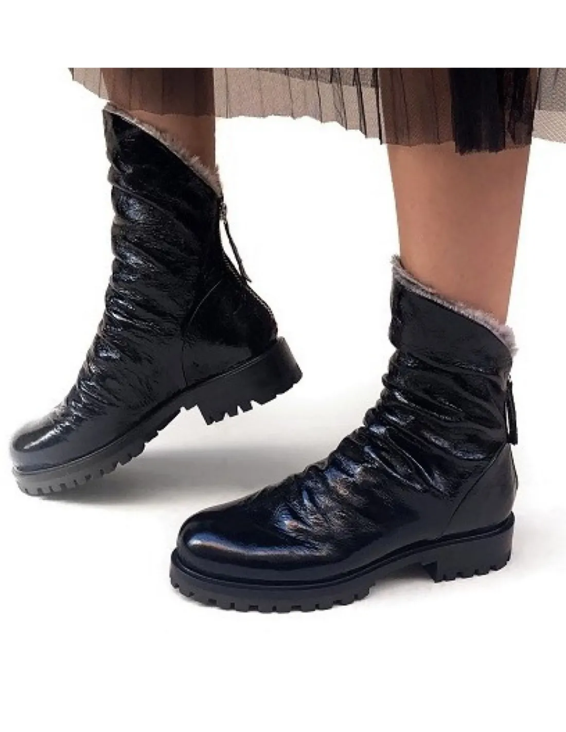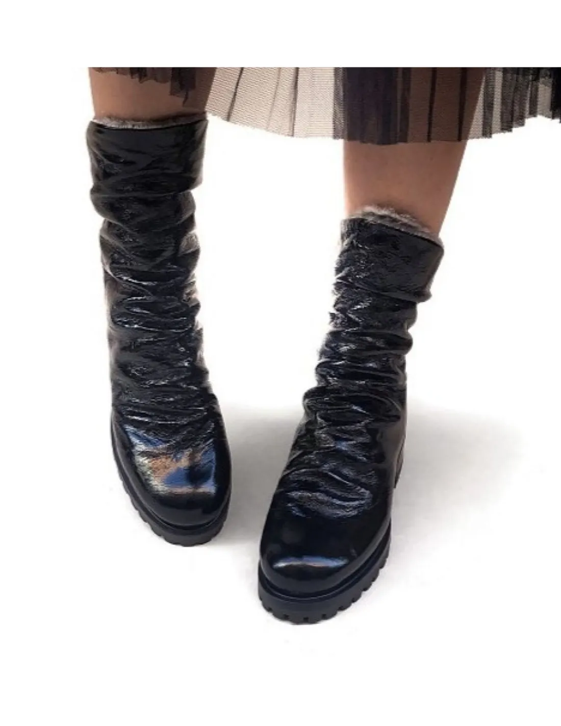 Niebywale komfortowe botki, klasyczne, eleganckie, wykonane z miękkiej skóry lakierowanej metodą naplaku, czyli lakieru kładzionego na luźno położoną skórę. Dzięki tej technice buty są bardzo miękkie, skóra pracuje, a po założeniu na stopy większość zgięć rozprostowuję się tworząc gładką powierzchnię z zachowaniem niezwykłej miękkości skóry. Skóra na cholewkach lekko opina stopy i jest delikatnie drapowana w zamierzeniu projektanta powinna się lekko marszczyć- uzyskano ten efekt dzięki zastosowaniu specjalnego kroju cholewek. Całość botków wykonana jest wyłącznie z naturalnej skóry. Zapewne do pokochania bowiem diabelsko wygodne i efektowne.
