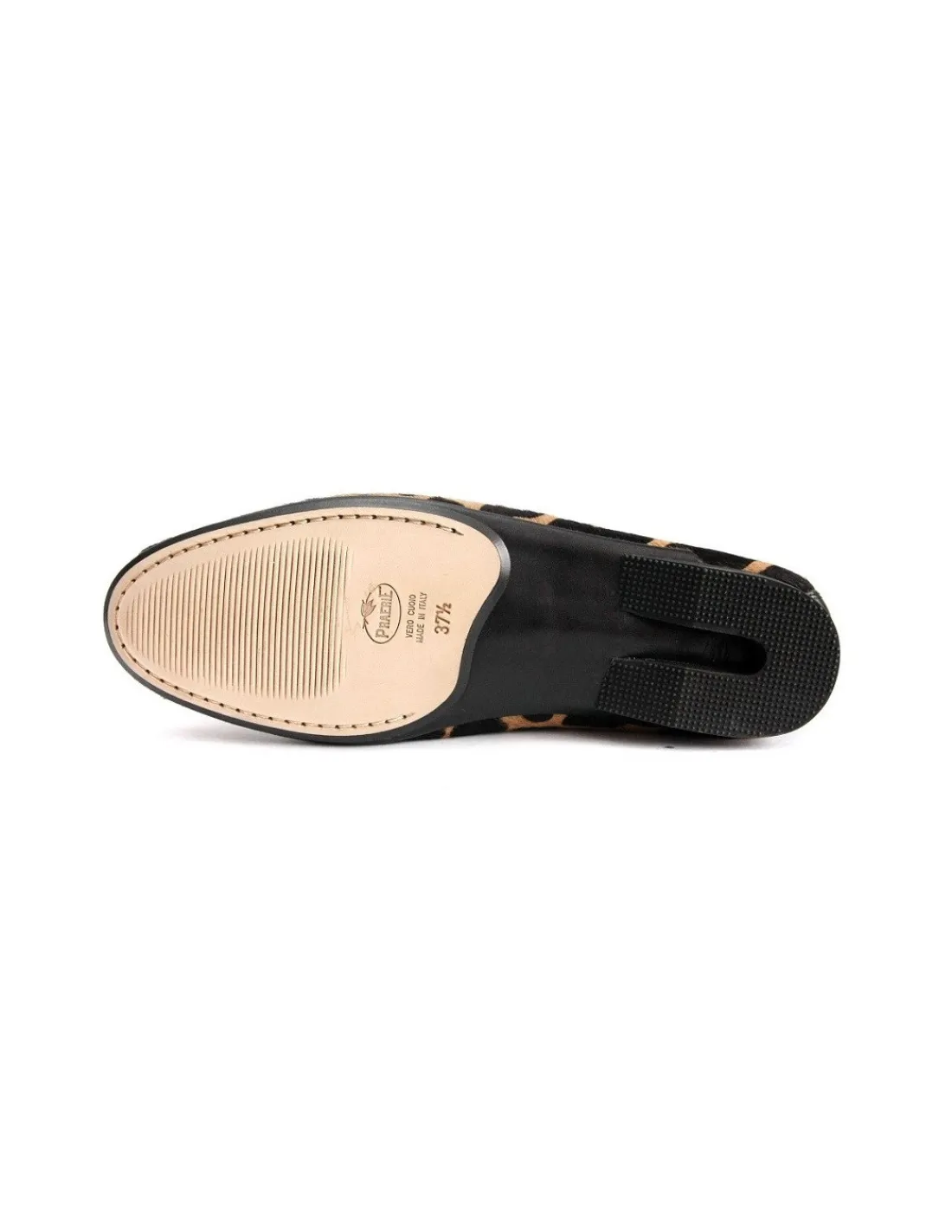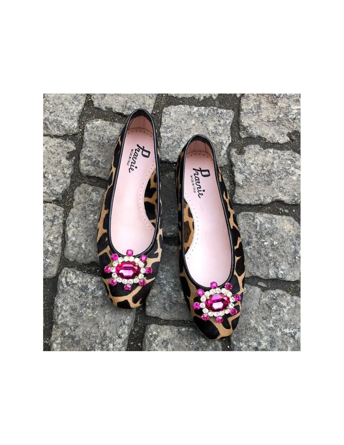 Te balerinki wykonane zostały z naturalnej skóry z pozostawionym włosiem, z printem zwierzęcym na wzór leoparda – w cętki o odcieniach brązu i beżu. Niebywale interesującym dodatkiem są ozdobne, duże, różowe kryształy odbijające światło oprawione w metalu o złotym kolorze. Przepych i bogactwo w tym wydaniu jest niebywale kobiecy, trochę ekscentryczny i na pewno wyjątkowy. Ten bukiet kryształów osadzony został pomiędzy wycięciem cholewki i noskami. Efektownie komponująca się linia, wysmukla nogi i sylwetkę mimo braku obcasów. Cholewka wykończona jest rulonikiem czarnej skóry, dzięki temu po założeniu na stopy baleriny nie „otwierają się”. Buty wykonane zostały z jednego kawałka skóry ze szwem w linii pięty , maskowanym i wykończonym podobnie jak wykrój cholewek czarną skórą. Całe wnętrze balerinek, czyli zarówno wkładki jak i futrówki również wykonane zostało z naturalnej skóry w kolorze pudrowego różu. Obcasy niewielkie , wyodrębnione w czarnych skórzanych obłogach.