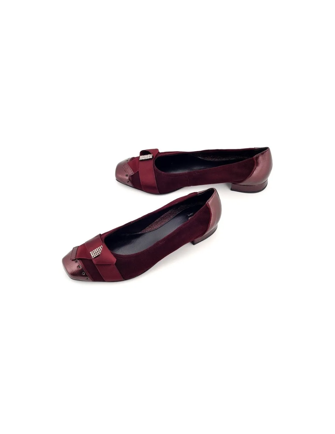 Noski, zapiętki i obcasy wykończono skórą lakierowaną również w kolorze bordo z metalicznym nalotem. Wnętrze ze skóry licowej – bajecznie miękkie. Na przodzie efektowna ozdoba – na jedwabnej taśmie przymocowanych zostało kilka rzędów kryształków od Swarovski.